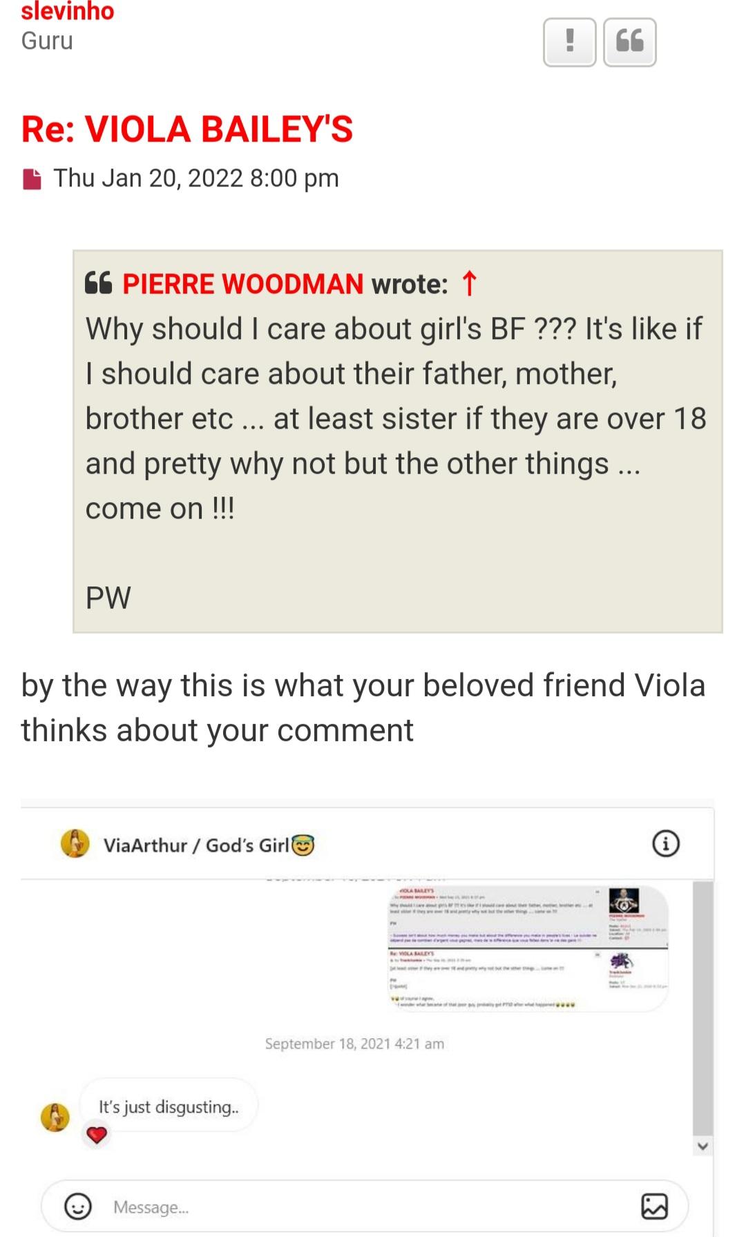 Lol I wonder what he thinks now. Now that his beloved Viola number 1 on his site just confirmed he is disgusting lololol