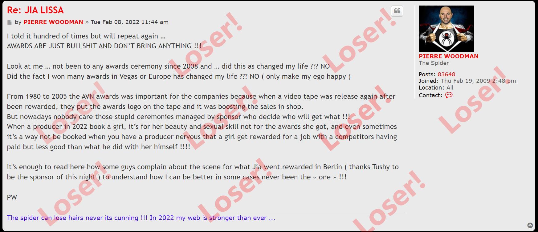 That's because he's still living in 1990 Valencia. In those day's porn films were "cheesy" and lacked any real substance, but since then they've gone really upmarket with some films rivalling mainstream works. Unfortunately, nobody told Mr Woodman so he's still using outdated handy-cams and shooting porn films in poorly lit cheap hotels. And he's putting the fact that he's not won any awards down to the organisers of the events not liking him, not the fact that he produces crap. Like the immature baby he is, he insists that a models success is solely down to seeing "HIM" first when in actual fact she would become successful anyway . . . In fact, she'd probably be more successful if she completely bypassed him all together!