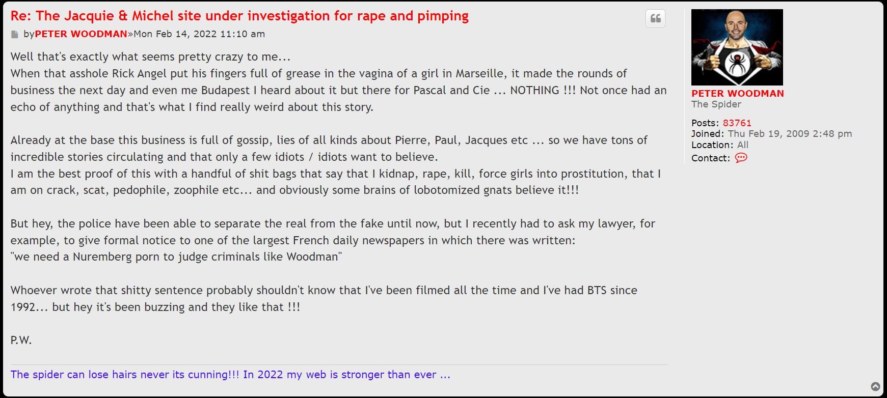 Well, you are right. I produced more than enough ammunition for the legal team of xxx/wgcz regarding a supposed upcoming legal case from Pierre Andre Nicolas Gerbier (also known as Pierre Woodman) where he filed complaints about various matters concerning: himself, his wife, his daughter, his brother, his male and female "friends", his son(s), who's ex- wife of multiple years got her shit fucked straight up the asshole on multiple occasions by Gerbier-, his newlyfound brainwashed "friend" Cayenne Klein and whoever the fuck he says that he needs to defend in court, him being a supposed scatman, a supposed animal porn lover, him being a supposed incest porn lover etc.