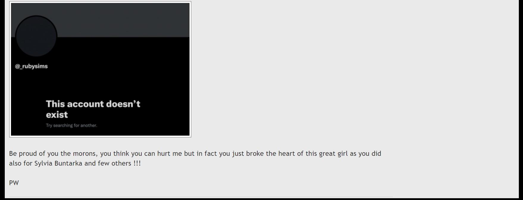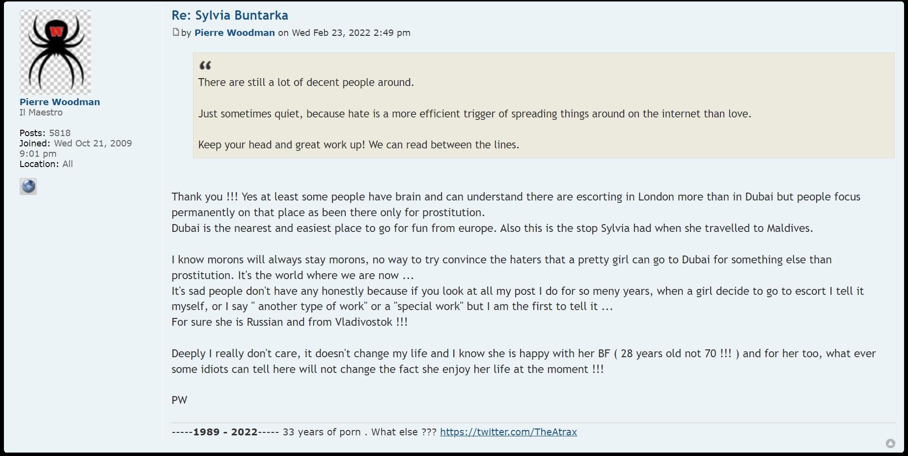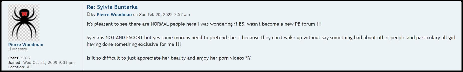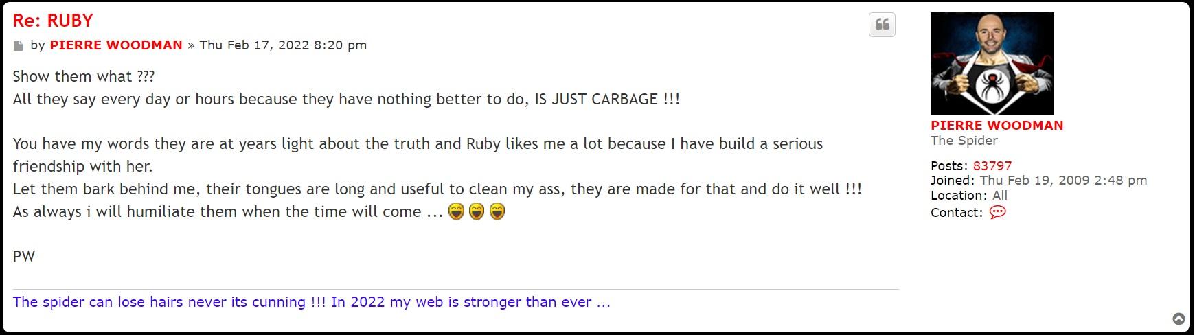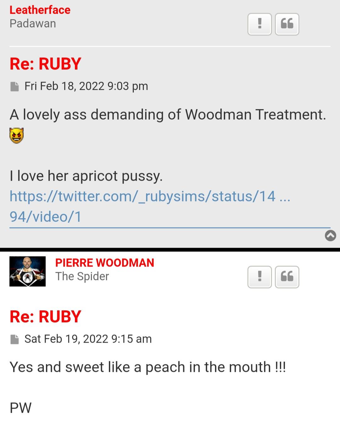 ValenciaCF wrote:I'm always right. She don't want to be associated with that ape. He is watching this forum 24/7 :D and he was so paranoid because we so easily get under his skin all the tine, he became paranoid to send message on his forum he had nothing to do with it hahaha. Pierre Woodman the man who ends careers and pretends he builds them lololol how many girls he ruined so far in small amount of time. Or how many escorts he filmed shall I say.... Alisia,Sylvia, Ruby Rizzo, Bambi, Bad Barbie, nina lust, braza corazon, alexandra targaryen,sandra blue and now Rubi Sims.