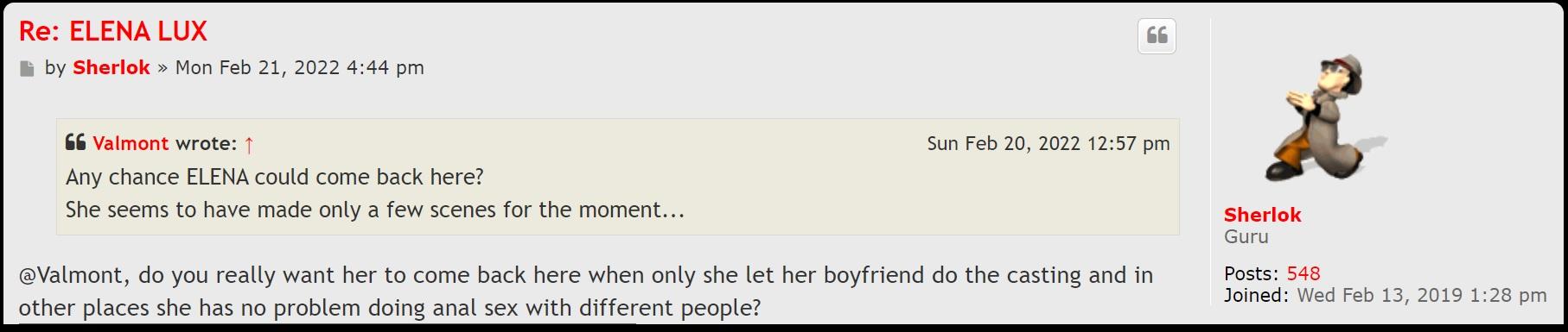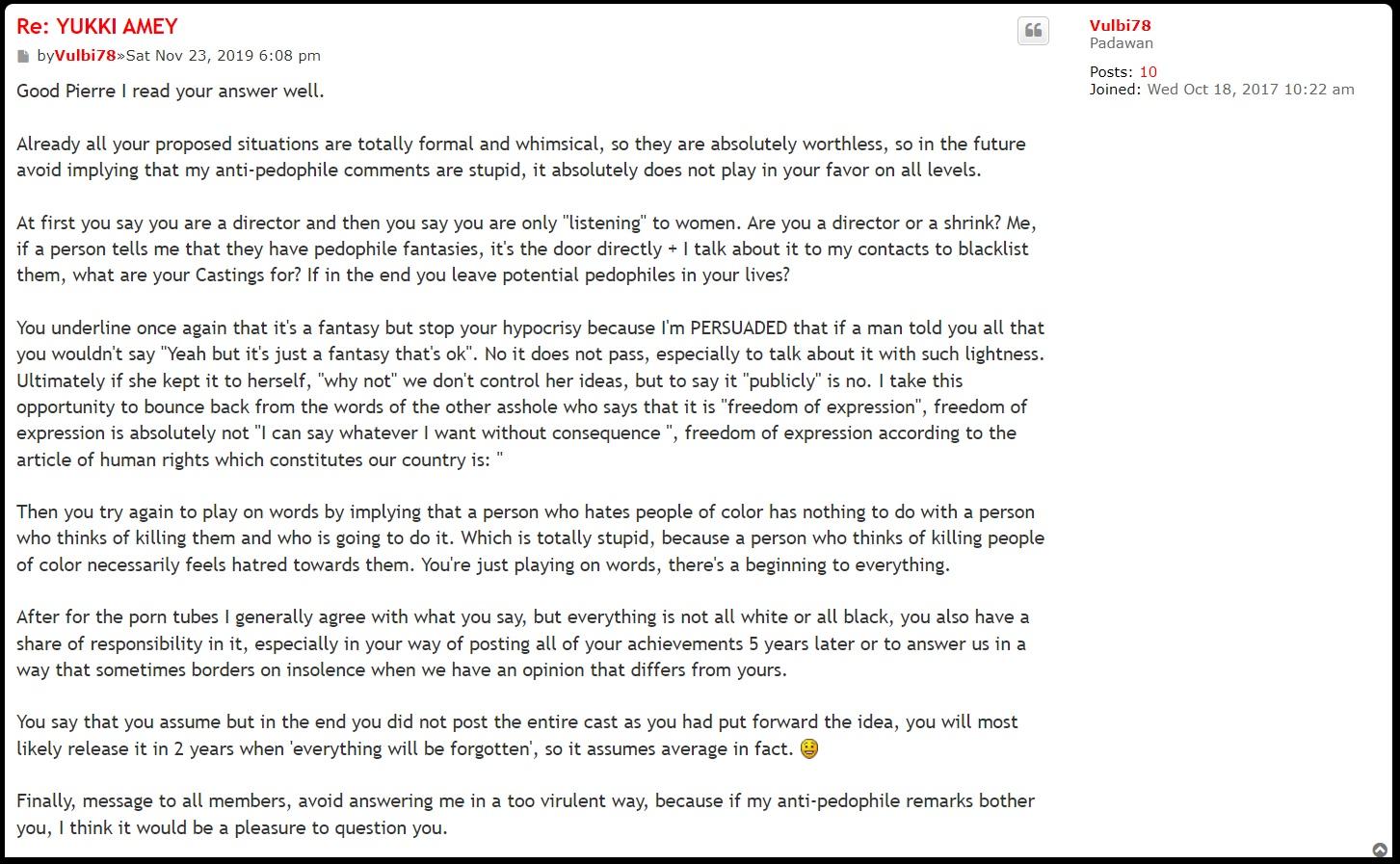 Imagine a girl who goes to a shoot, thinking she's just going to do an interview and a scene with his friend, (a friend who recommended going there) and finds herself in front of a producer who starts to discuss something she don't want to do, but for hours and hours and doesn't stop in front of her no's. But of course it's the others who are heartless. Sure. And also boasts on the forum with 'You over estimate my power'.