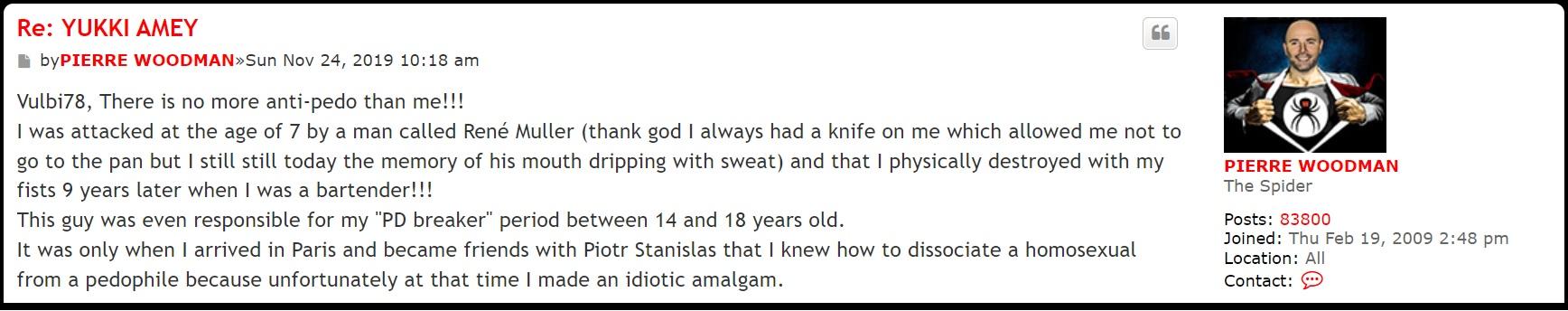 I think there is far more to this other than just Woodman being gay, he displays other strange features that don't belong to someone of normal sound mind. "Cgr69801QUvm_mYtbbqMt_r_p" stated that Woodman had ADHD and I believe that this could well be the case here, this would certainly help create the creature that is Pierre Woodman.