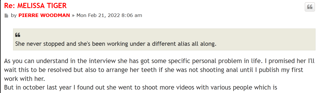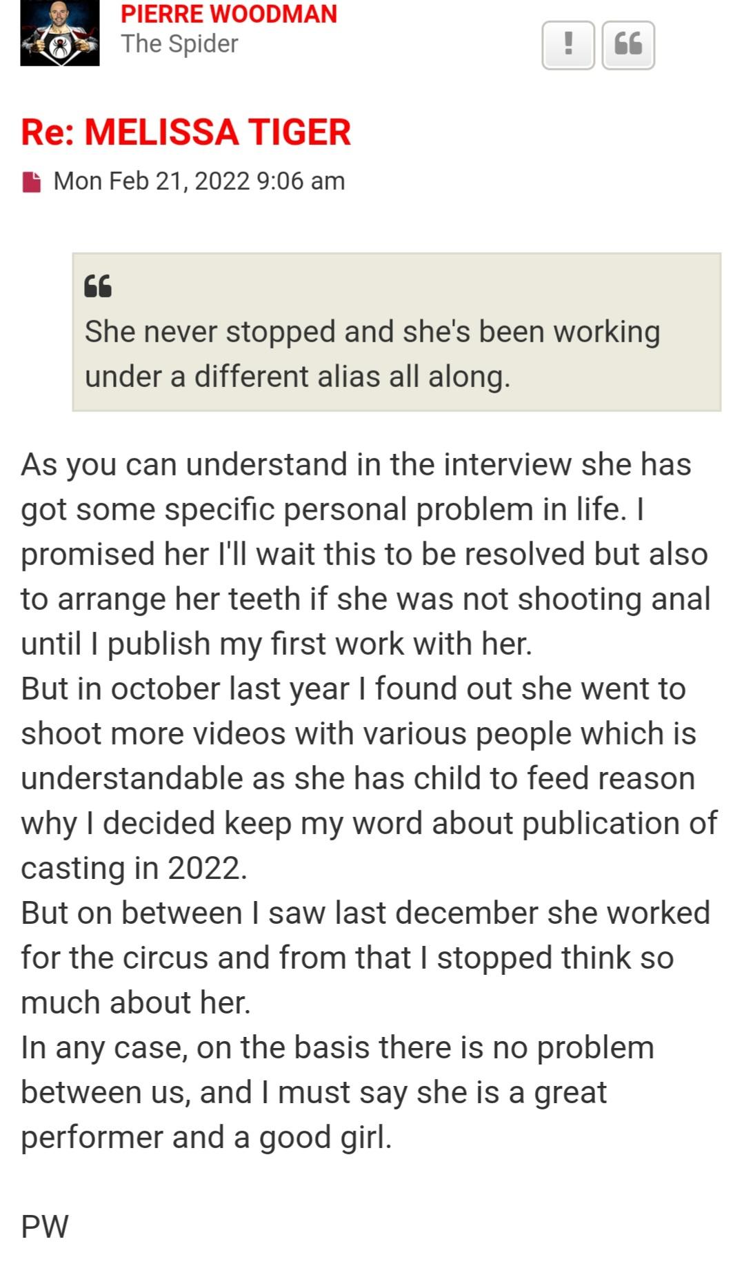 Maybe we should ask Nela Decker what happened to Melissa Tiger and Pierre Woodman. She stopoed porn for personal problem he says, meanwhile she was doing porn and didn't have problem with pornbox.Trying to con her with Demtist appointments lololol Maybe she had problem with you Pierre :D :D :D that,xs ehy she chamged her name and went to pornbox,making you look like an idiot for all what you said