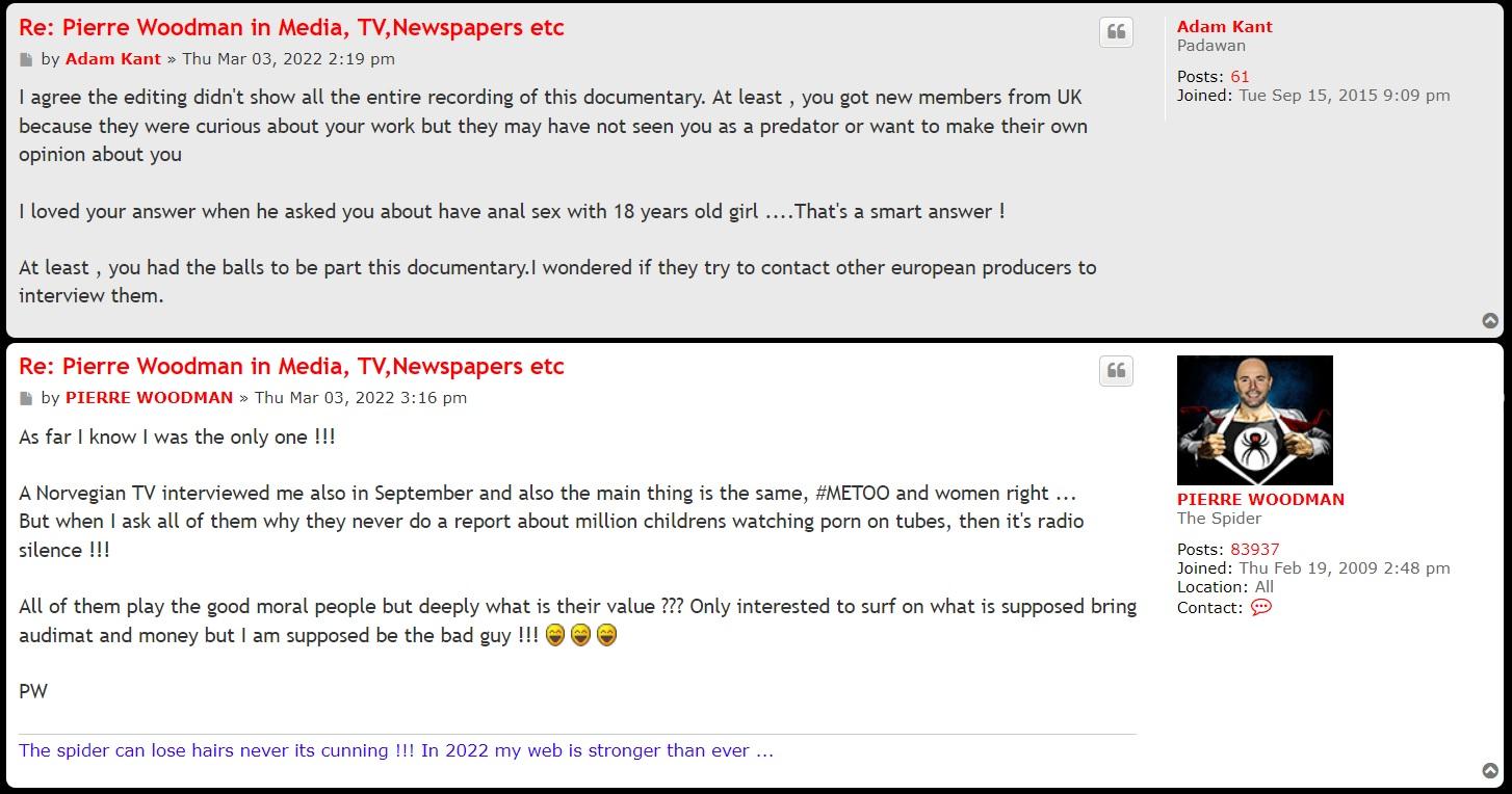 The point I'm trying to make is, yes its a porn forum but this subject has allowed the darkest, deepest and most disturbing views of Pierre Woodman to come to the surface and FINALLY, some (3) members have seen Woodman for who he truly is, and taken it upon themselves to leave.