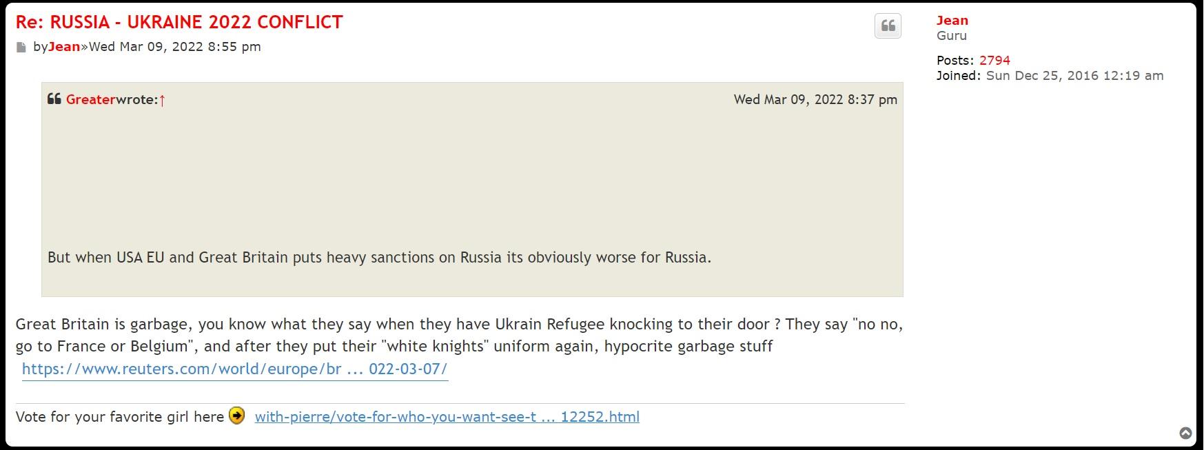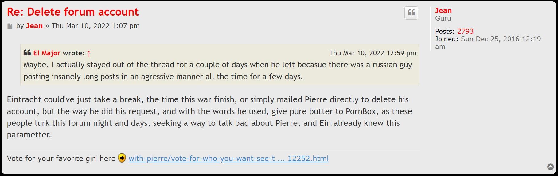 That Jean says Eintract and Liabatyds departure is bad for the forum and the side in respective to us here at pornbox, so thats bad. Having a Russian Troll spamming undisturbed and tolerated the forum with Kreml propaganda and Woodman coming out as full on fascist is obviously not giving the forum a bad name.
