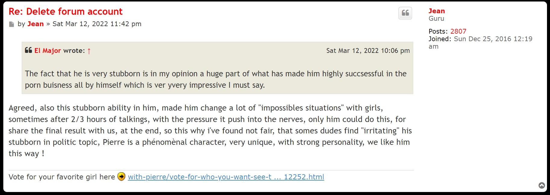 Oh, you are so right "Jean" (aka Pierre) it is butter for some on the Pornbox forum because "Eintracht" and "liabatyd" departure from your forum finally shows you for who you are. You're all going on about the reason why they left was simply because they disagreed with Woodman. It wasn't.