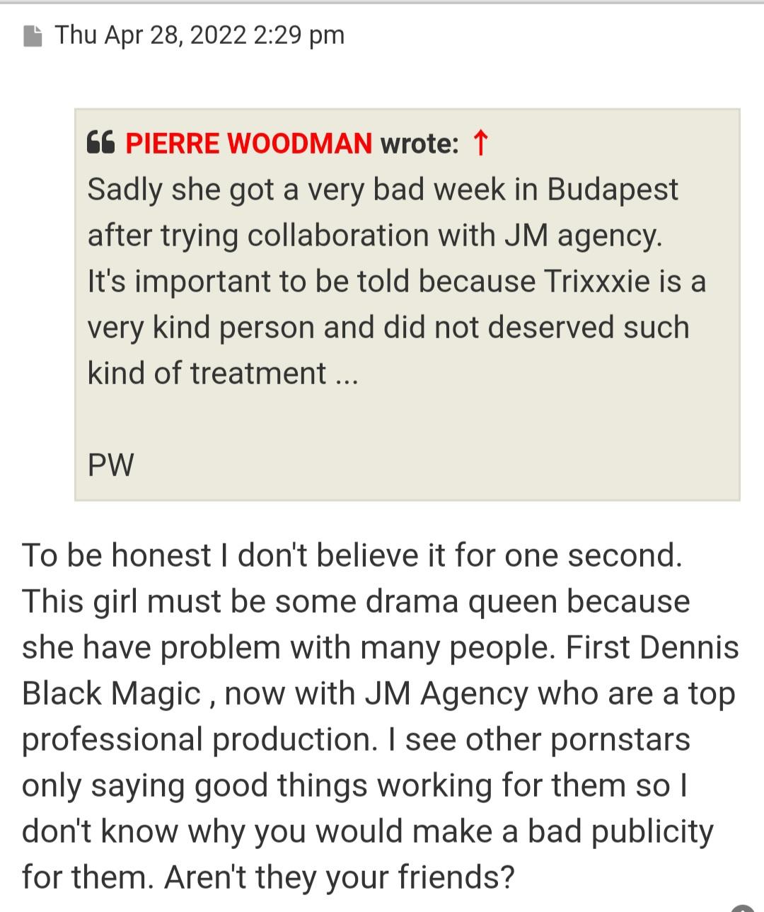In that specific post there was a chance to point out that what Woodman says about models that do a lot of anal, working/appearing on LP/AV and not being successful afterwards is bullshit. He proves it himself by also continuing to book them himself.And isn't something you can deny.