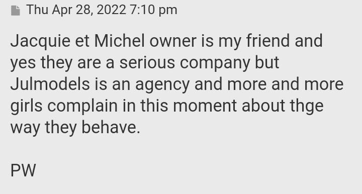 Woodman...you are a sad, sad, old man who is jealous with rage. Why you always throw shade at your competitors. You just show the world how jealous you really are. And btw, what you say is all lies, you telling that this agency is bad is only coming directly from your mouth, not from these girls....Nobody can see them complaining. They are happy. They go to parties with the Julsmodels and you are not invited to it but you want to be a part off it , everyone knows! But you on the other hand, everyone complains about YOU! Take your lies and shove it up your hairy ass!