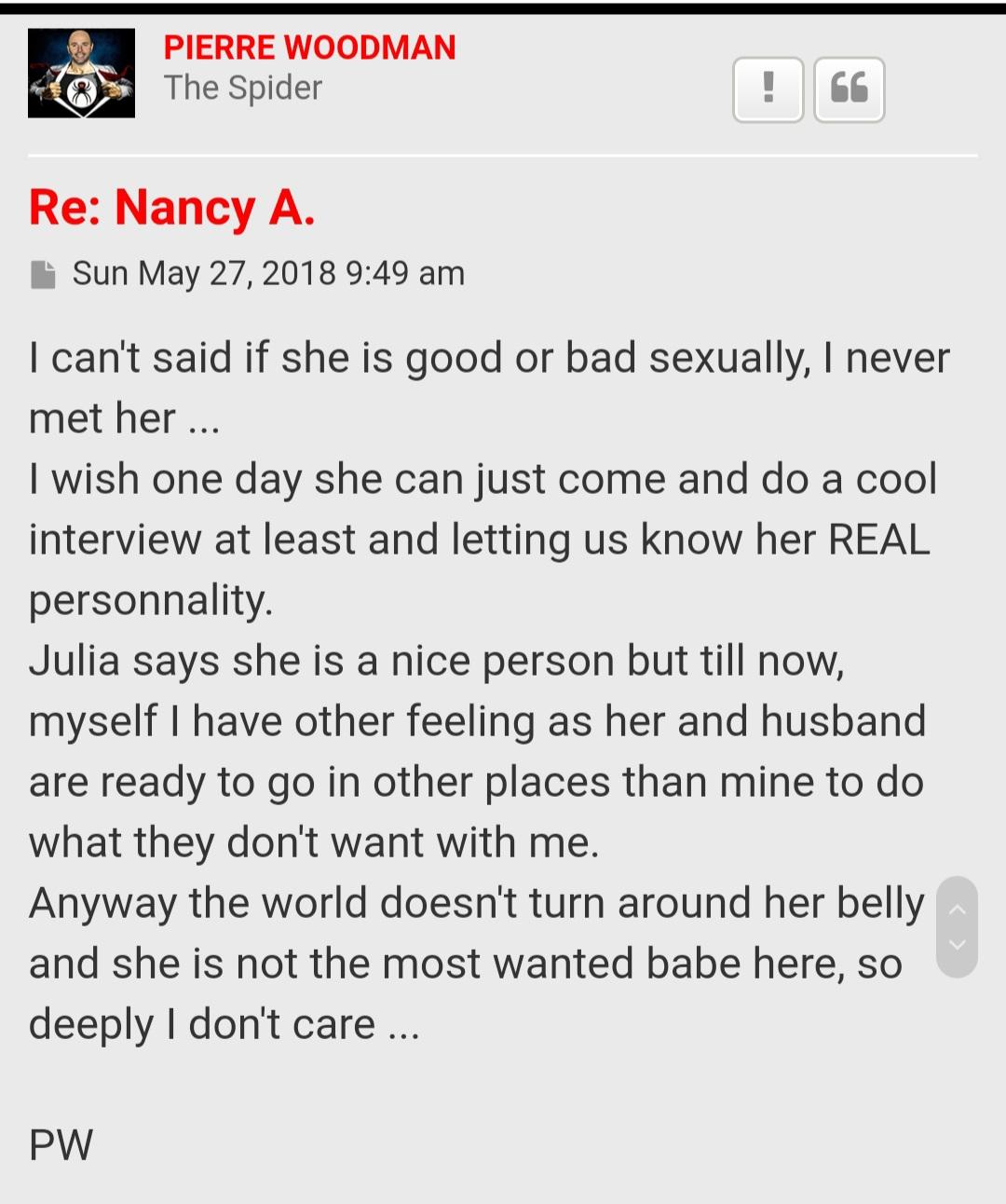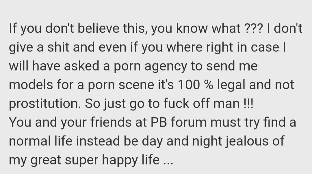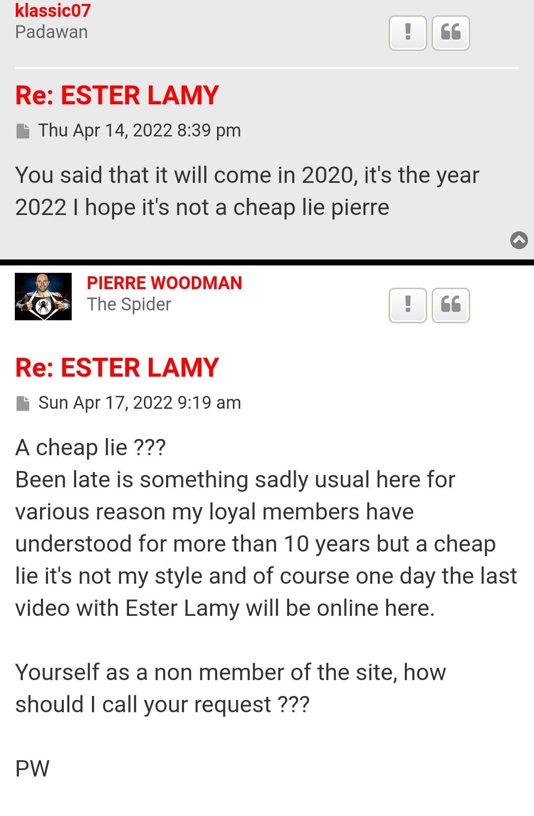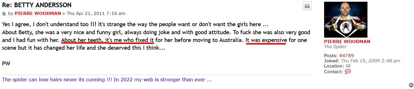 Anyway, moving on this is an interesting exchange between a member called "Vianeta" and Woodman. This reasoning by Woodman shows EXACTLY why nobody wants to know him any more. The actual conversation begins with a member called "Hector" who asks about Pierre meeting with Elisa Calvi."Hector".......You meet her yet?"Woodman".........No !!! I give up with them. They came here and went to various people but "forgot" call me ...They are not here to do porn for enjoy they are just building a business plan where all is calculated and honestly it's not my cup of tea. It's OK I keep concentrate on others !!!
