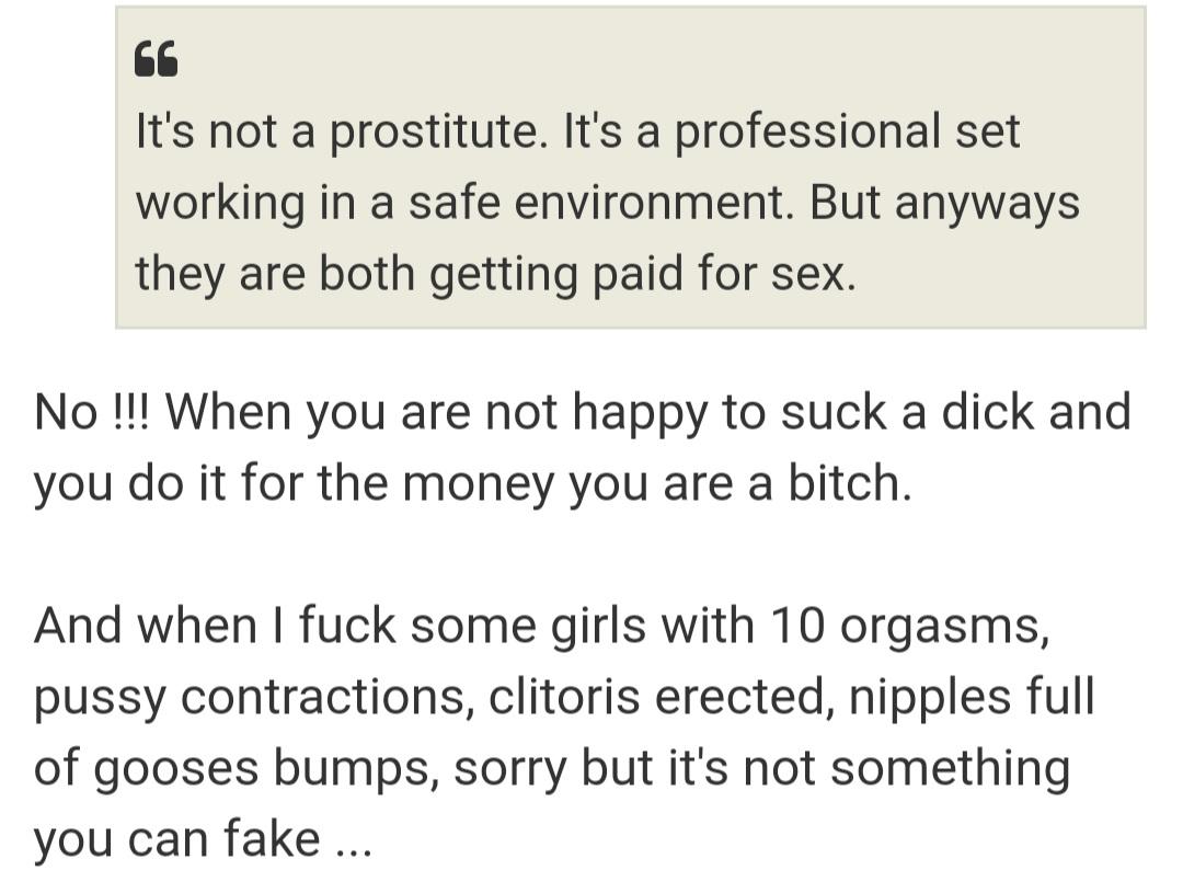 I've omitted a comment by "Lionel" because he's probably one of Woodman's alter-egos."Vianeta"......Well the girl is here to make money. Nothing wrong with that. Anybody who do a job wants to get paid good. It doesn't mean her boyfriend controls her because she does works for other productions. This concept that pornstars must do porn only to favour sex over money, is a bit silly. This is a vision of Pierre but everyone need to understand that at the forefront, porn is a business and it's not leisure. Pierre is at the end of his career so he can afford to think like this. He is also a businessman but the girls in porn also need to what's best for themselves as well. It's life. Life is tough. Pierre is lucky to have a nice life, nice cars, nice family etc. Everyone want that."Woodman"......I agree it's normal for everyone to wish earn money but the smart girls like for instance Clara Mia mixte sex and pleasure which gives a much pleasant feeling for producers and also sites members happy to see some real orgasms instead of the fake "music" they listen usually. It doesn't mean Elisa Calvi will not have a great future, as Anissa Kate who has 12 years in pon with success without a single orgasm on stage, she will probably get a lot of fans due to her perfect natural body, but for an old wild board like me most imporant is the feeling and I focus in priority on women doing porn for sex and money not just the money !!!"Vianeta"......Yeah but some girls play their roles perfect as actress and they manipulate their position to their advantage by pretending to enjoy the work and they do it well. When they do this, they know they will make the employer happy even if they pretend, and in return they also will get paid. So some girls do it well. In the end they are also smart, because actresses can 'act'. Sometimes easy to tell who plays this game, sometimes not."Woodman".....I'm not here to pretend I never do mistakes but it's easy for me to see the difference when a girl play and when she is real because I'm not just a producer filming girls at few meters from them, I have my DICK inside and can feel the difference, reason why for instance when you see the casting of Anissa Kate, her game was immediatly exposed on my camera and her BF was so furious on me after !!! And deeply I suspect this is the reason why the Calvi couple don't want work with me ...