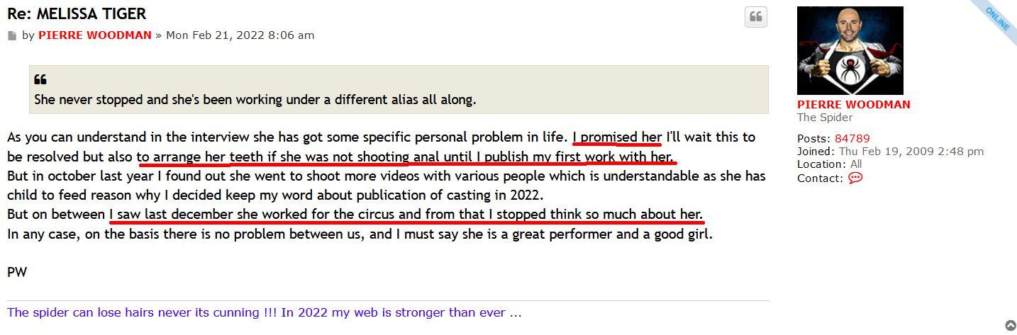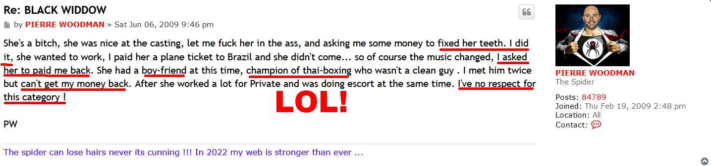 he speaks alot of words but really o action. As if a memebr subscribing to his site is going to make him upload the video. Very manipulative man but still full of lies that nobody is going to be easily fooled by. He is very much looking to make money from people by having them subscribe to his site but has the audacity to shame girls who visit him only for money as prostitutes. But he has o problem misleading and tryimg to trick his members to sub to his website and then give them reduced and unrequested content. Whst theu request he does not deliver. Anybody can see right through him. His ransom updates is a proof he can uodate it ir he wants but he just doesn't deliver om their requests and expects them to be loyal members. Make it make sense how he can do an update of a new girl nobody ask for but the main requests for years they begging him he ignore?ValenciaCF wrote:When is this 'Blarit' character going to realize that Laura Orsolya does not want to shoot with an amateur like PW. He can post selfies with her but she has no intention of ever working for him. She has no problem making porn with other stars, but never with Woodman. Why????bevause they are friends hahaha he tried so hard and he couldn't get it. Now he posts selfies of her to soften the blow. Stop begging your master. You can do much better elsewhere. All he know to do is cut and edit scenes and give you unfinished products. Yake your money sonewhere elsr because he only screwing you, not the pirates!