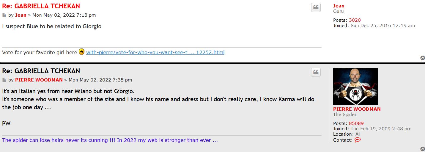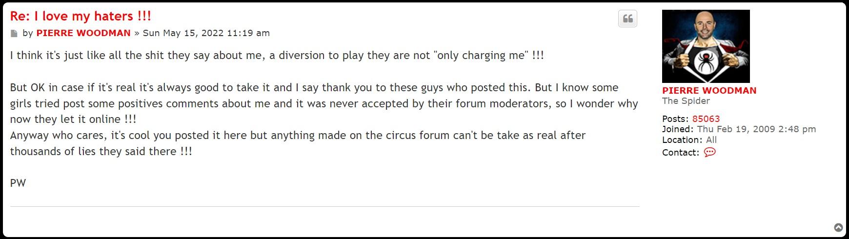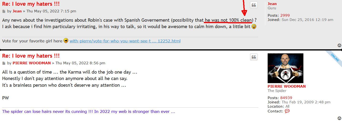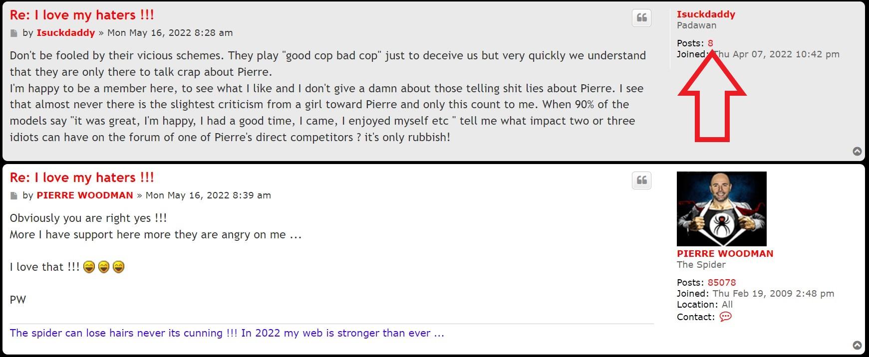 Then, as always, he is the first to respond to the topic starter with his main account pierre woodman, ACTING all innoncence and "defending" the one he humiliated/bullied/intimidated with his fake account.