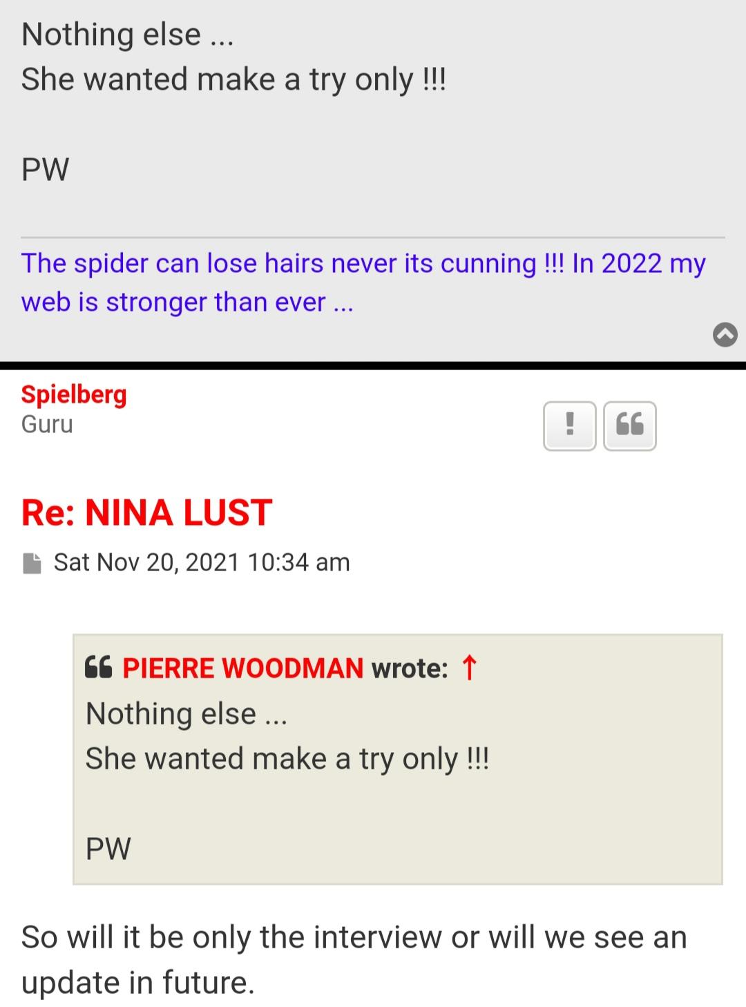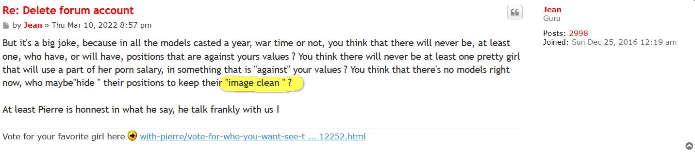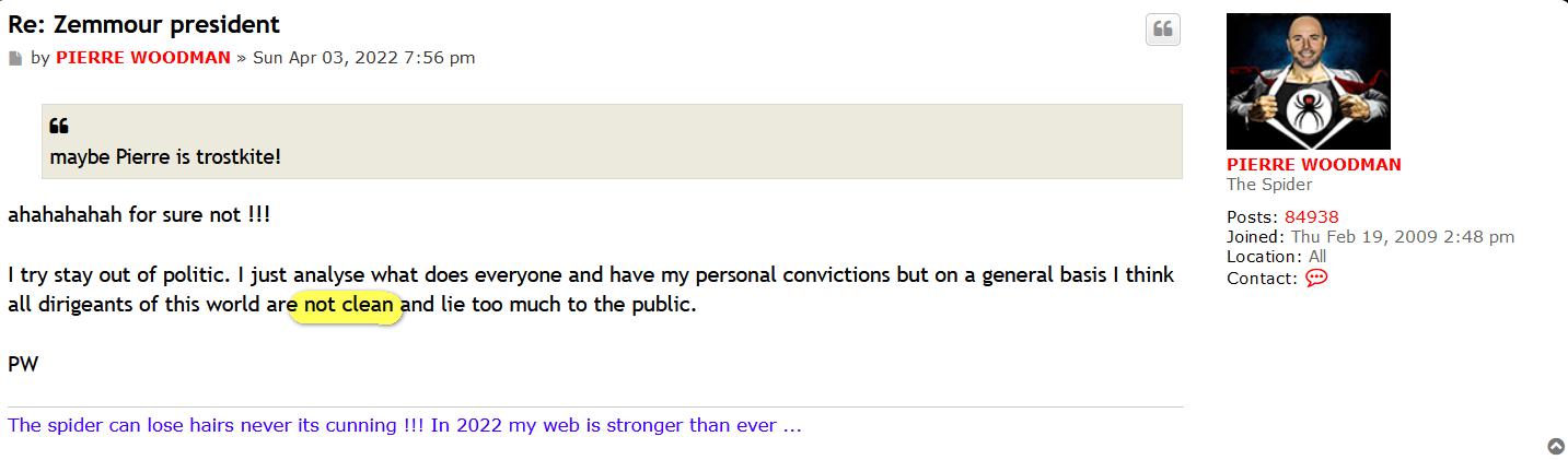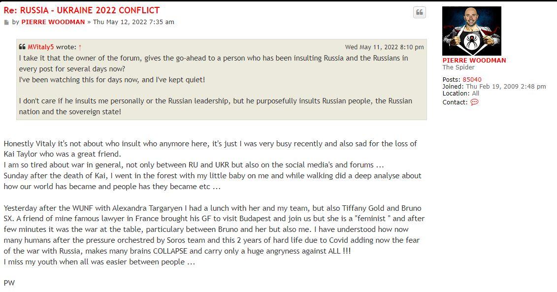 Then, as always, he is the first to respond to the topic starter with his main account pierre woodman, ACTING all innoncence and "defending" the one he humiliated/bullied/intimidated with his fake account.