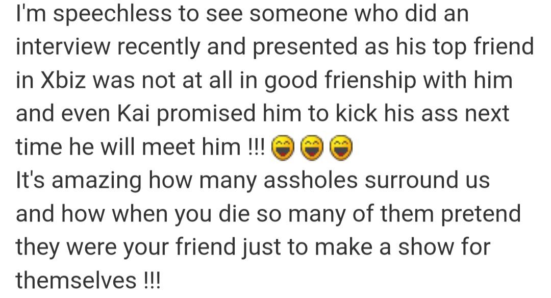 So this was in Kai Taylors thread. Pretending he was a top friends with Kai and throwing shade at Rocco, who recently did an interview with Xbiz and was the first to find out about Kai. Just imagine Woodman is so jealous, he even have to talk shit about Rocco for doing an interview about Kai.