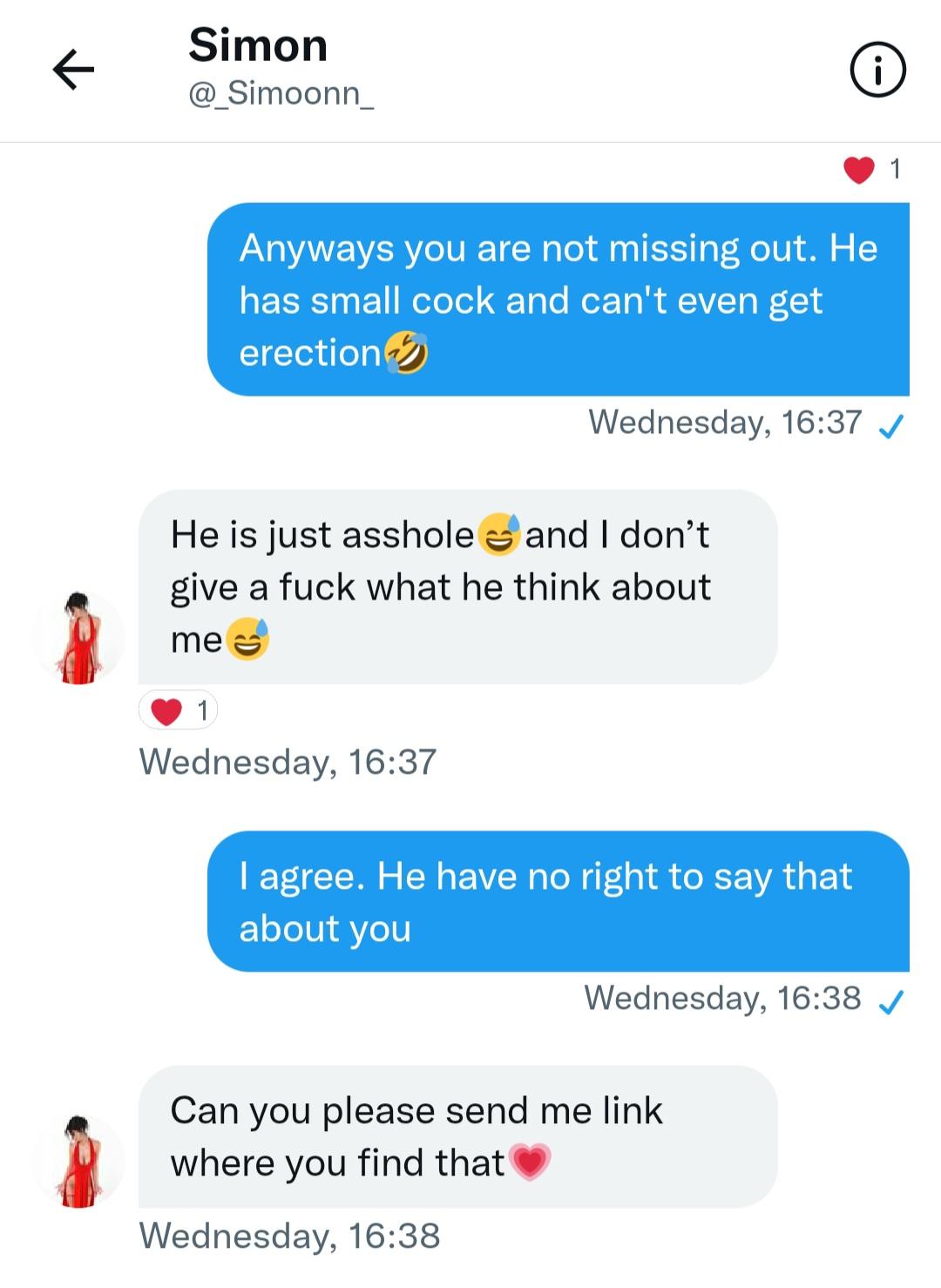 The funny thing here is that he does this all the time as he has done with other girls and recently Freya and Simon, talking shit without facts, just spreading total bullshit because hos ego can't handle it as Freya mentioned, and he has the audacity to tell people speak bad about him. What a clown he is. Is he just ignorant and stupid or what. Or he only listens to whatever garbage he blabbers from his own mouth. He really has dementia I think :D