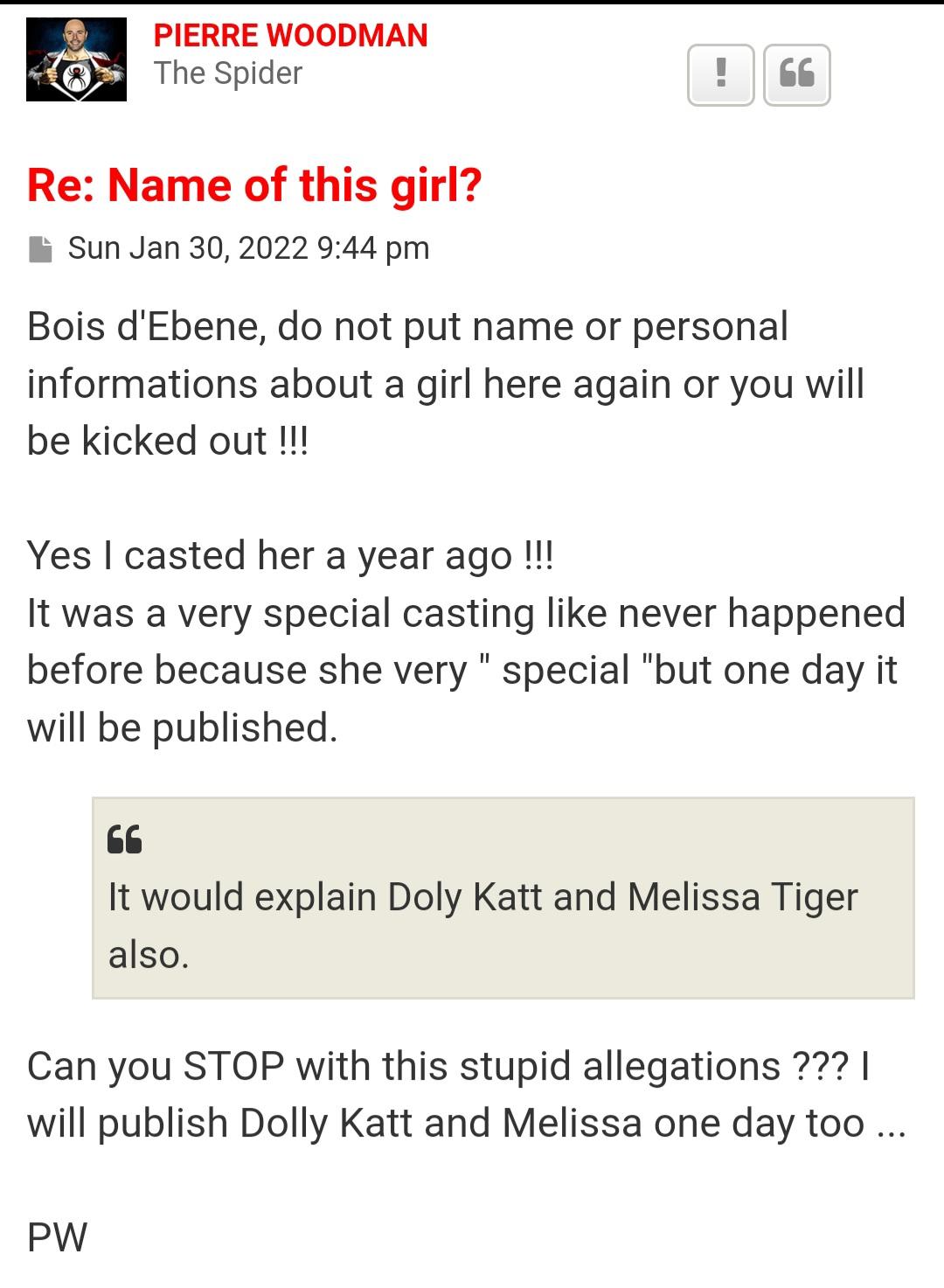 Although I can't name who they are I can GAURANTEE you that at least one of them has told me (in confidence) that THERE IS NO VIDEO OF HER BEING INITIATED by Pierre Woodman. She was sent for a CLOTHED casting. Woodman offered to show her his "special system" ..... She refused, someone from her agency was there with her and can vouch for her. He asked her if he could tell people that he did a full casting because it would get her jobs!!! She agreed. But I say again THERE IS NO CASTING for this model. I only wish I could call Woodman out with the name of this one because his statements on his forum that he sodomized her is a complete and UTTER LIE!!.......... That will also mean these other castings that are always coming next week, next month, and next year, are a lie too.