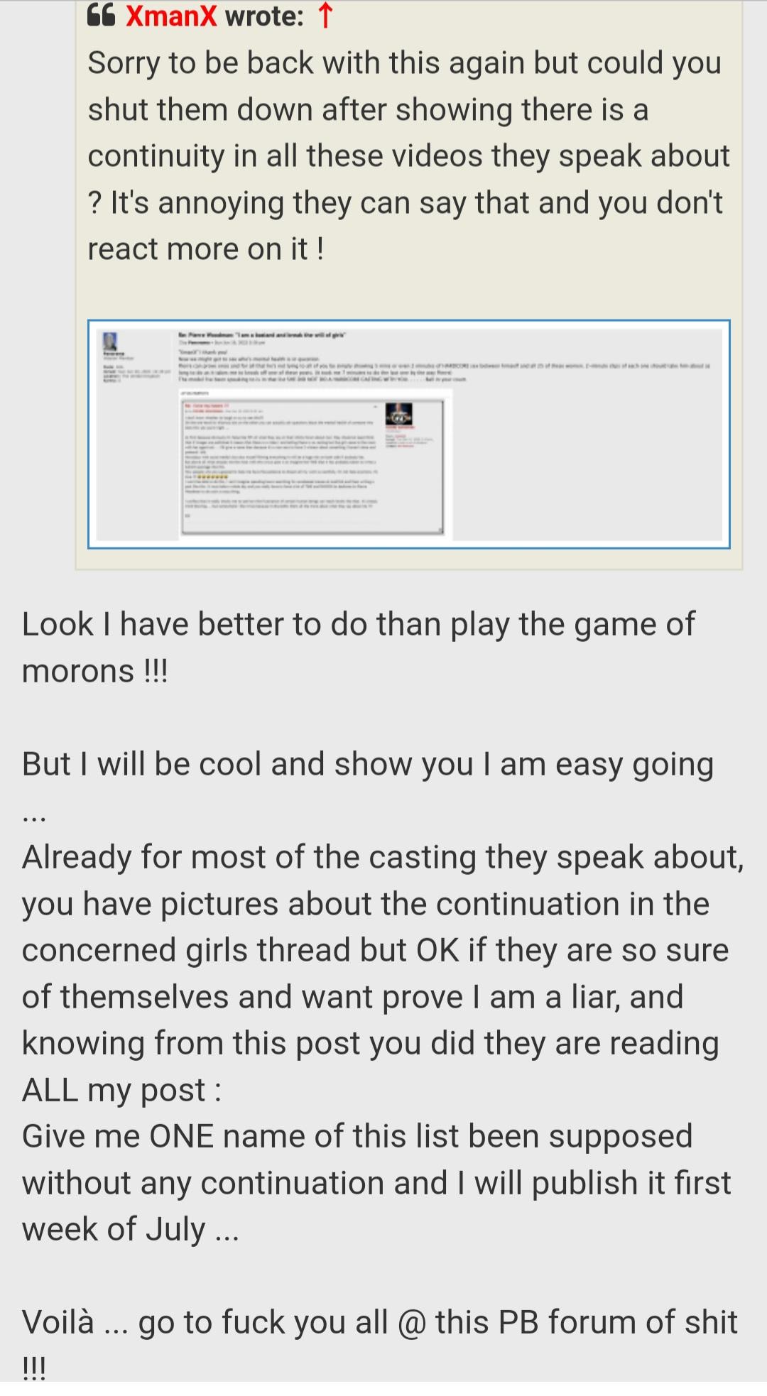 He is calling our bluff now. But you know what the funniest thing is? Recently they called him out for his empty promises and one member clowned him for promising them Nicoline's casting which he made 1000 promises for 10 years and still he didn't do it...but suddenly...now with magic he is willing to make a casting 1st week of July to prove himself that there are videos of all these girls listed and we are lying. When you attack his ego, he will do anything. So easy to get under his skin :D :D :D what a clown this man is. He just proves that he chooses not to give his members what they request although 'he potentially could' but he pretends he makes them happy. Ehst is his members still subscribing for? He basically said he can update any video but he won't give it you whem you want but he will give it pornbox on request necause his so ego is so fragile. What an idiot! :)