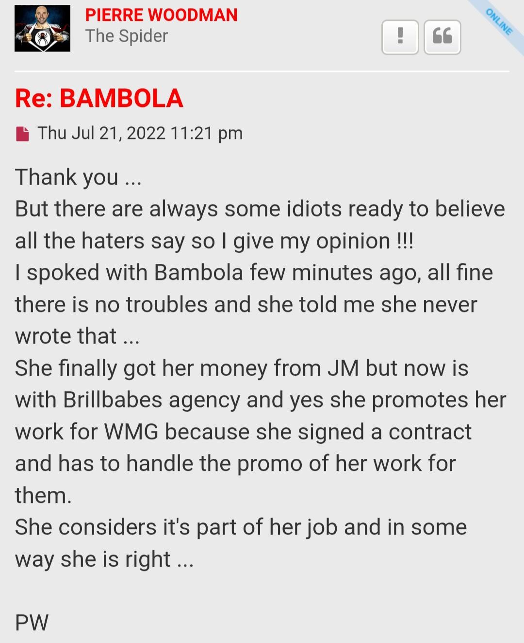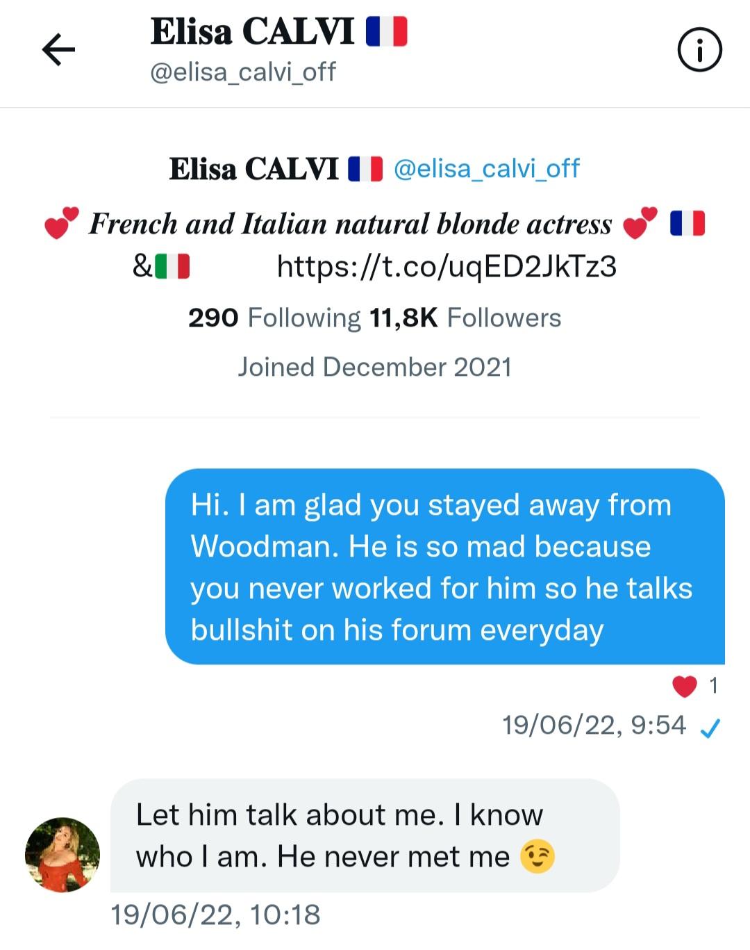 Elisa makes a good point in her last words, PW is too good at only showing a single part of conversations, leaving out all the parts that don't favour him, so he shows only what he wants. Just lile he did with Stacy Bloom. Clown! Why he never show his conversation with Bambola??? Because it never happened and he couldn't fake that entirely.