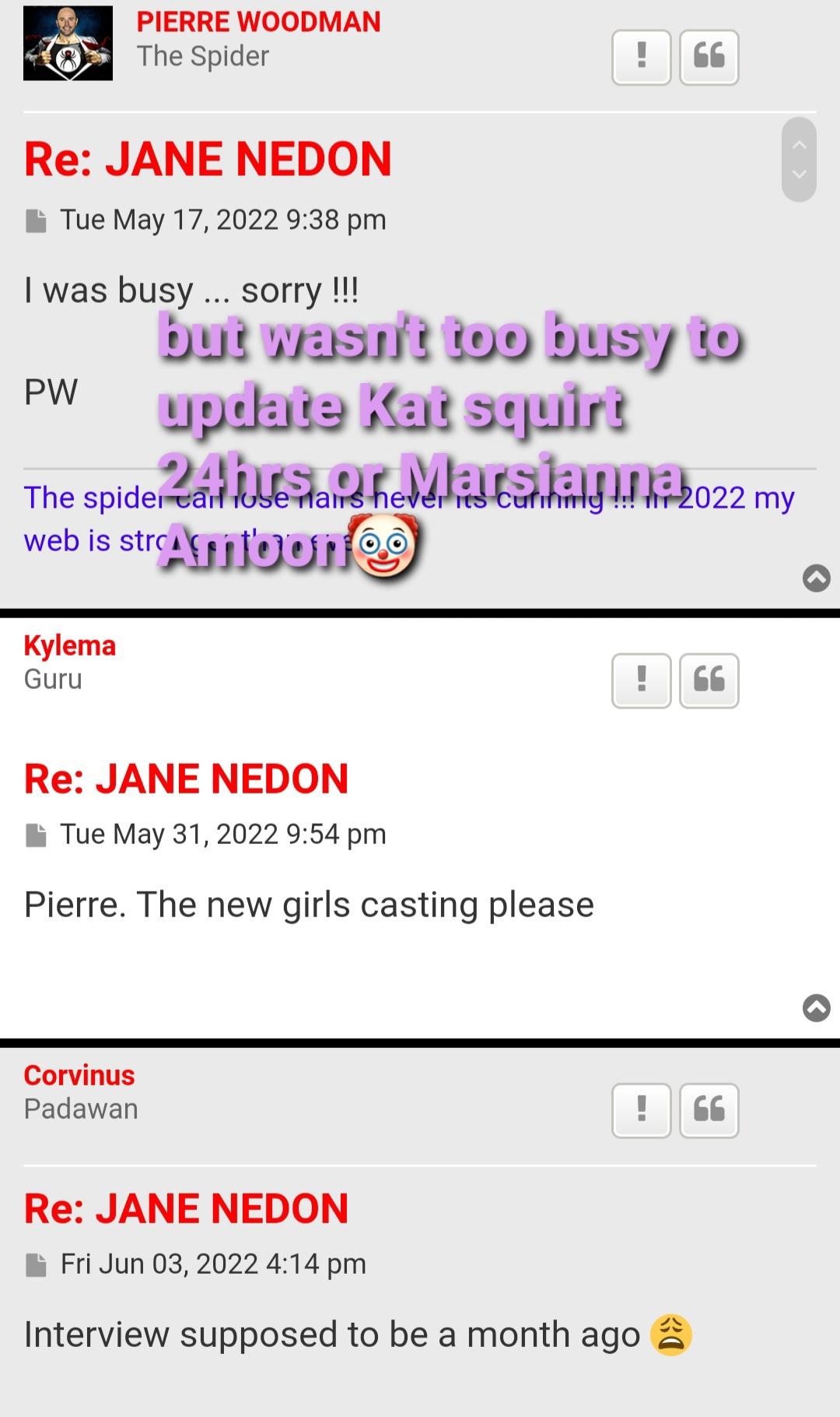 So in actual fact he does not care about his membets. He also told some of his "non member" that Kat Quirt casting would be updated, but just imagine what his longterm members must be thinking about this. He has no time to update older videos which they request, but has time for pornbox and non members requests lololololol. Clown.