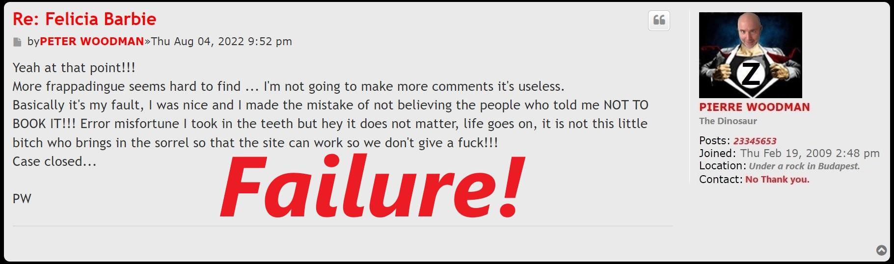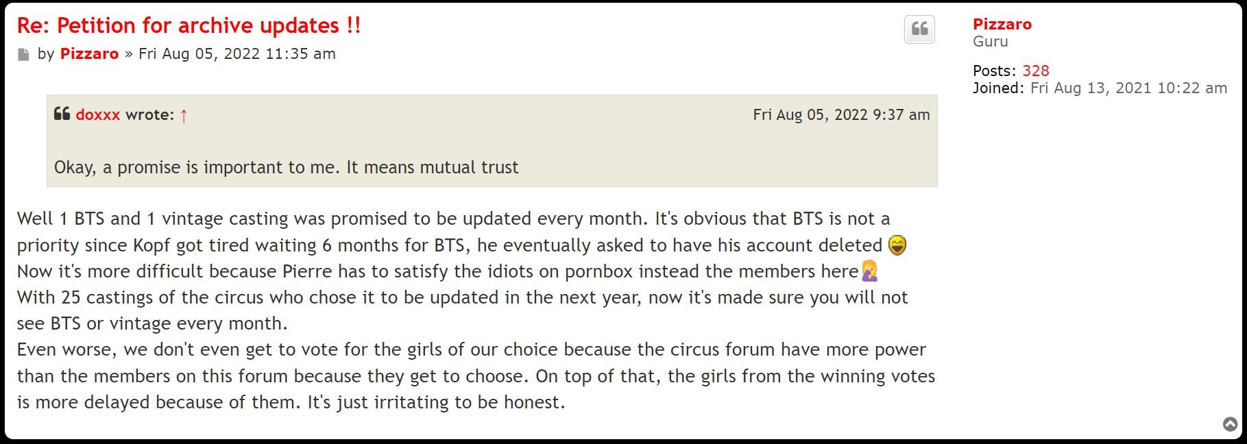 this is exactly what I thought when I read this. The level of ignorance and disgust to which he replies to doxxx says everything you need to know about Woodman. He makes a primise to doxxx and his members 6 months in advance. He ignores all doxxx's posts on the BTS thread, yet he replies on this telling him he's annoying him with BTS. So it means he reads his requests but just ignores him. He talks about priority of his members, yet so many long term members got tured of him and left his forum.