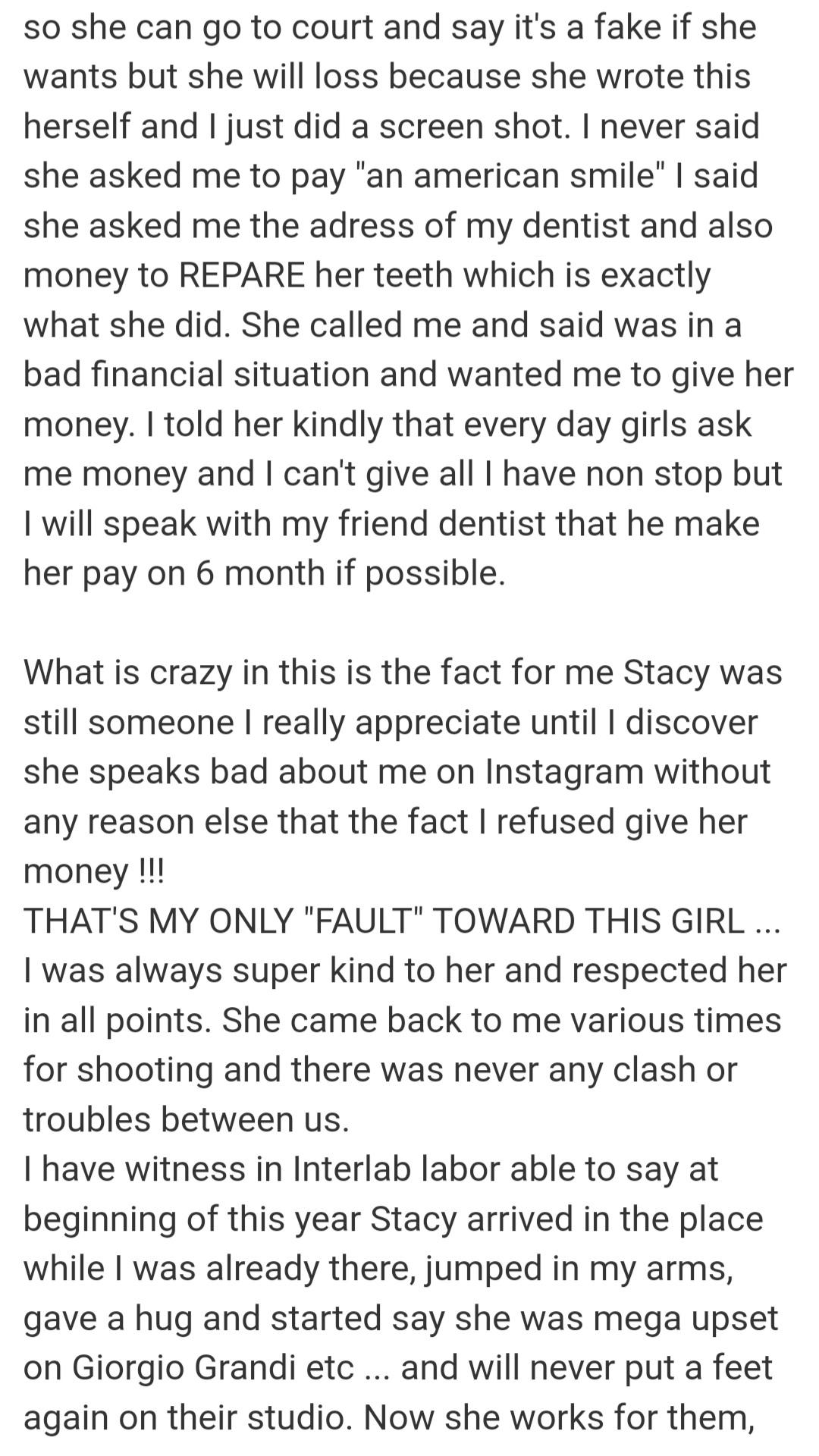 Here you can see for yourself how Woodman LIES and MANIPULATES words. At no point did Stacy Bloom ask him for money. She asked him to help her with a "recommendation" for a Dentist because the dentists she either didn't know or they were closed(his words from previous chat) . He only screenshots part of the conversation suiting his side. Why he don't post the full chat.