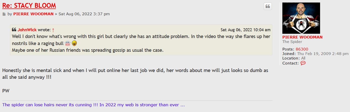 BlueShadow wrote:Cgr69801QUvm_mYtbbqMt_r_p wrote:Why did this bitch pierre andre nicolas gerbier (pierre woodman) not show proof that stacy bloom asked him for money for an american smile? Because he lied and she never did. She solely asked for a dentist she could go to while in a foreign town. Alternative facts , huh LOL.
