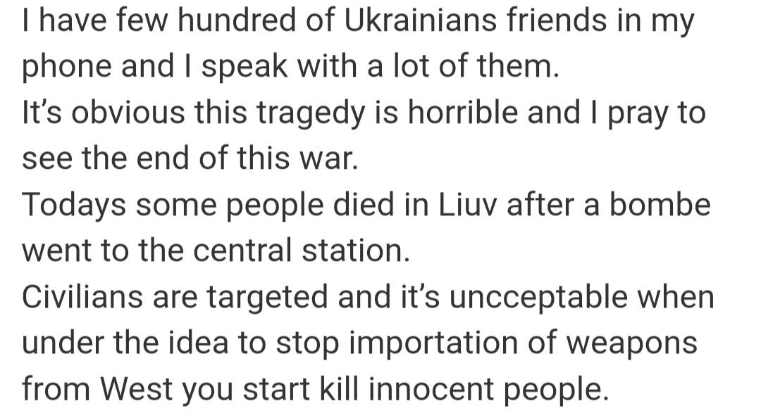 Pierre Woodman wrote: "It’s obvious this tragedy is horrible and I pray to see the end of this war. Todays some people died in Liuv after a bombe went to the central station."