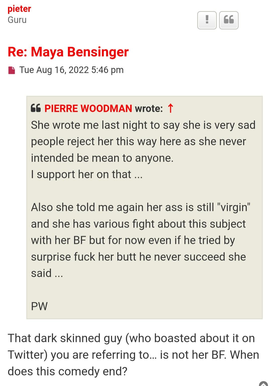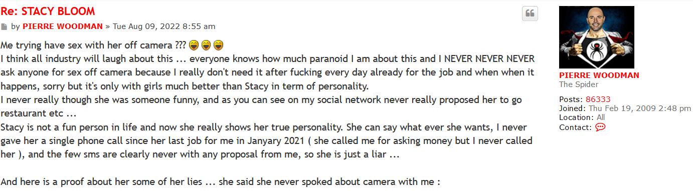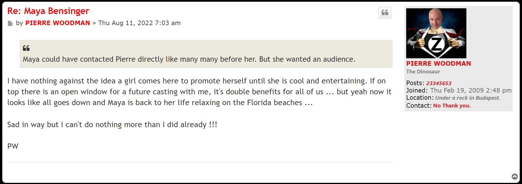 Your thread/topic on his site is a shit show. Be aware that the gross majority of people posting on his forum is gerbier himself. He uses fake troll accounts to fabricate stories and for example help him set up a favourable narrative for his main account pierre woodman. This is because he has no true friends in his life or on forums and because he is a coward who hides behind fake accounts, especially when going after male and females within the industry. For example directors, actors, actresses, agents, agencies etc. He's a pussy.