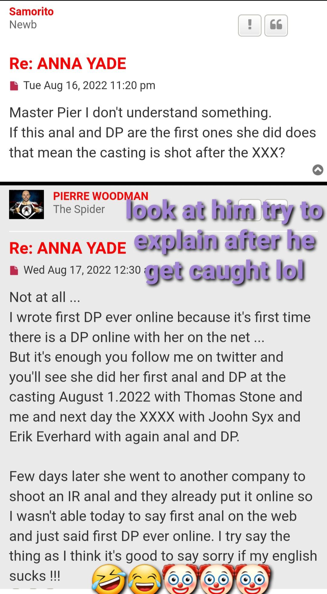 ValenciaCF wrote:What Woodman doesn't say to his members and doesn't know what I know, is how he forced Anna Yade to do a rimjob on him and make her cry(the part he cut out he speaks about initially but decides to uncensor it). He forced her to do it even though she said NO and pulled away and didn't want to. Now he wants to embarass her for this because sge went to Prague. What a bastard he is!!! But don't worry. More fireworks coming soon. This bastard rapist should be castrated for all the shit that he does and gets away with. Fucking rapist!!!