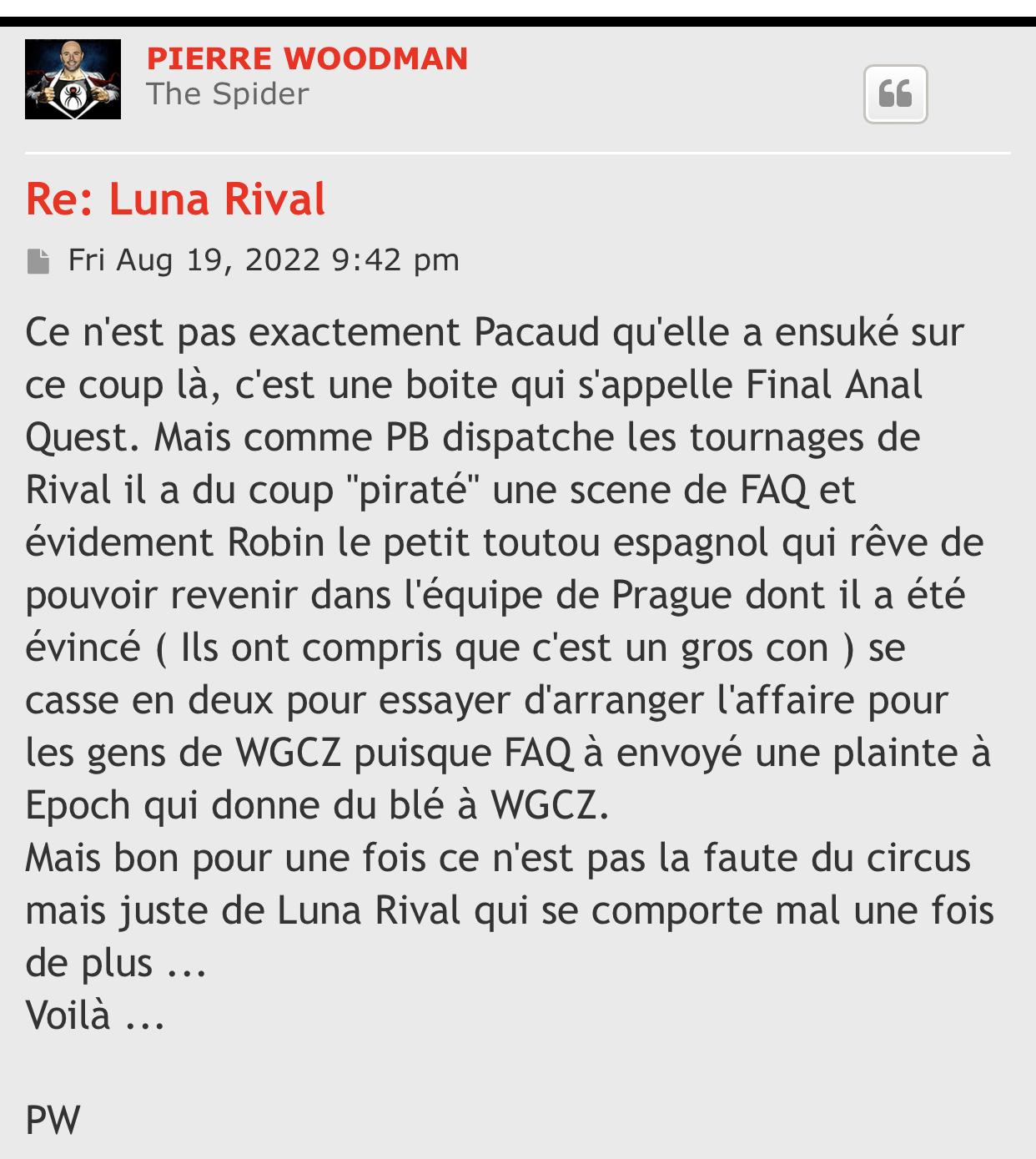 robin_reid wrote:There were some misunderstandings (on both sides) and it’s me who disconnected and left. Nobody has kicked me out of any place and in fact my last conversation with the studio owner for wich I’ve collaborated was just 2 days ago and it was himself who approached me weeks ago to try to fix things. I have nothing to do, never worked with, I don’t know anyone from “WGCZ” as he says. If I did what I did about that video with Luna Rival is just because I did not liked me what Luna did and to help the FAQ owner, a very good friend (I even do thanks to him other small business/incomes out of porn). As always this rapist, racist, pimp, pedophile, homophobe and over all, pathological liar, inventing stories to try to degrade others.