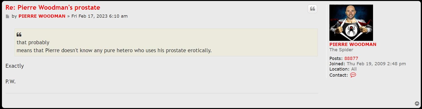 Pierre seems to think that any form of stimulation of the prostate by yourself can make you gay, and that he doesn't know any pure hetro that uses his prostate erotically!