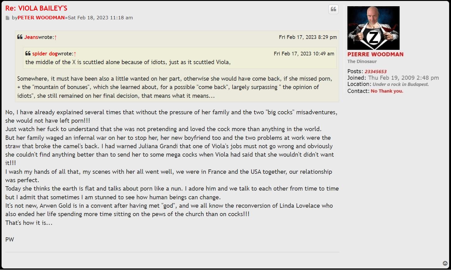 He declares that because of "other" forces Viola Bailey quit porn and never sees, or accepts that the reason why she left porn was because of men like him. I know most men don't see it, or want to see it but women, are human, they have thoughts feelings and emotions just like us, even porn stars. Just because a woman does something, she is not always doing it because she is sex mad and just built to fuck. A lot of the time women will do things (be talked into doing things) that they don't necessarily want to do. They'll do it to please others. This is a remarkable and sweet thing that any man should cherish and be grateful for.