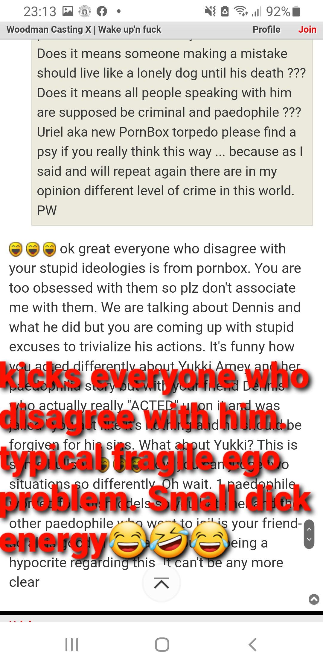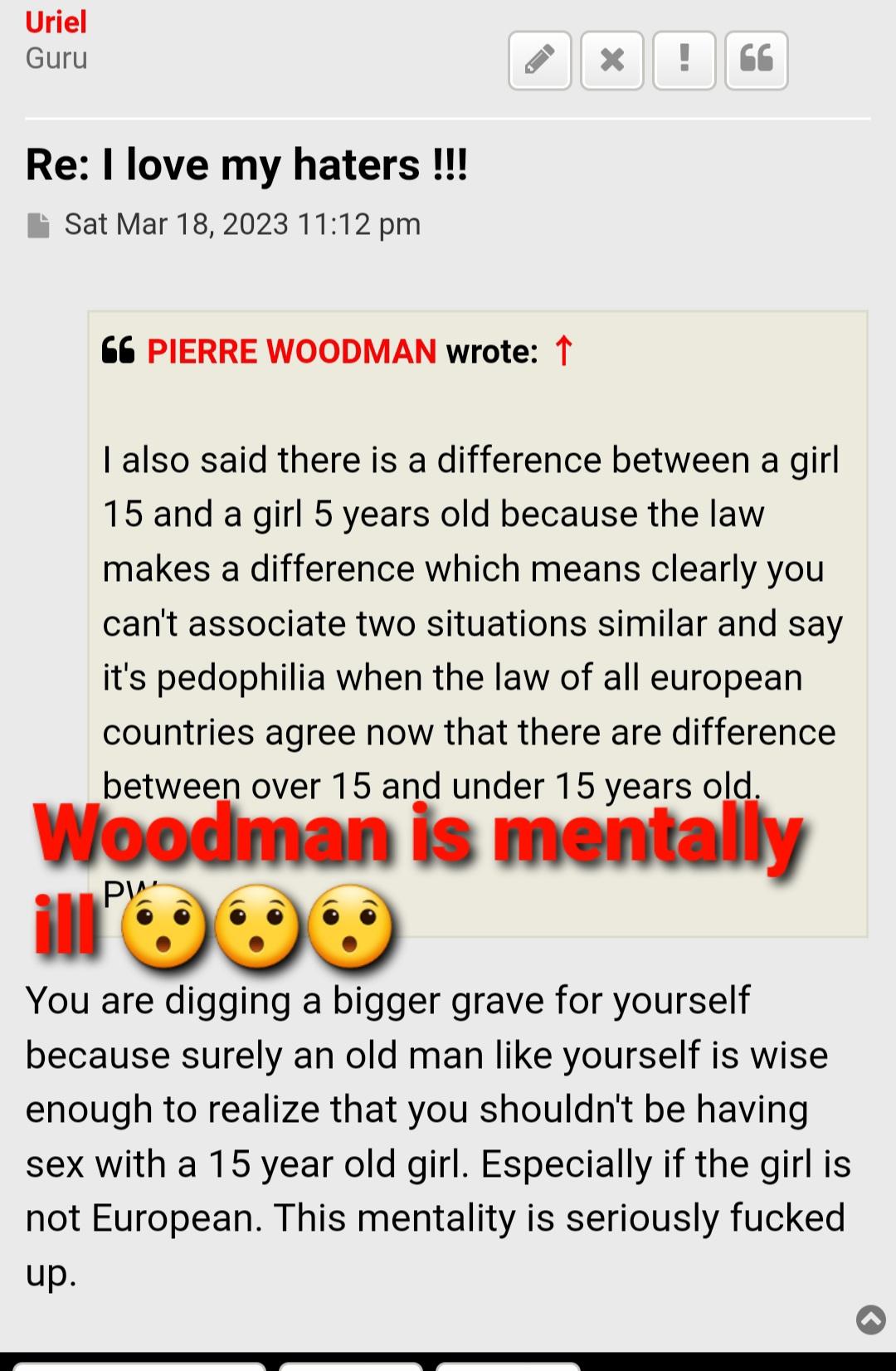 Right after Woodman boots Uriel from his forum for his opinions, Sladyen(aka Woodman in disguise) couldn't help but throw insult to Uriel about paedos lolololol - something so typical of Woodman to do) notice how Sladyen keeps appearing to fight the battle of her porn Columbo "Woodman" and paedo "Michelangelo" Dennis Burkas :D :D :D :D :D