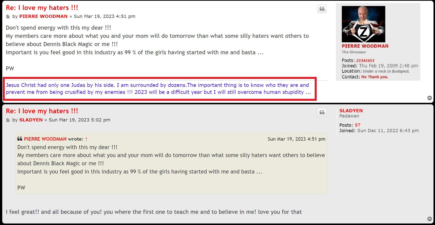 One more thing to add and to prove that Woodman is behind the Sladyen posts. Yesterday in the haters thread, Sladyen made that post. There were no images. If you go and have a look now, it is edited with pictures and her playing the lawyer of Dennis Blackmagic as if she knows everything but she is still a newbie in this business who knows nothing. The mistake that Porn Columbo Woodman made was adding pictures because once you make a post, you have about 30 seconds to edit it, thereafter you cannot edit a post. But today, by magic the posts wer edited with additional pictures. Only Woodman has authority to do that, members of the forum cannot....