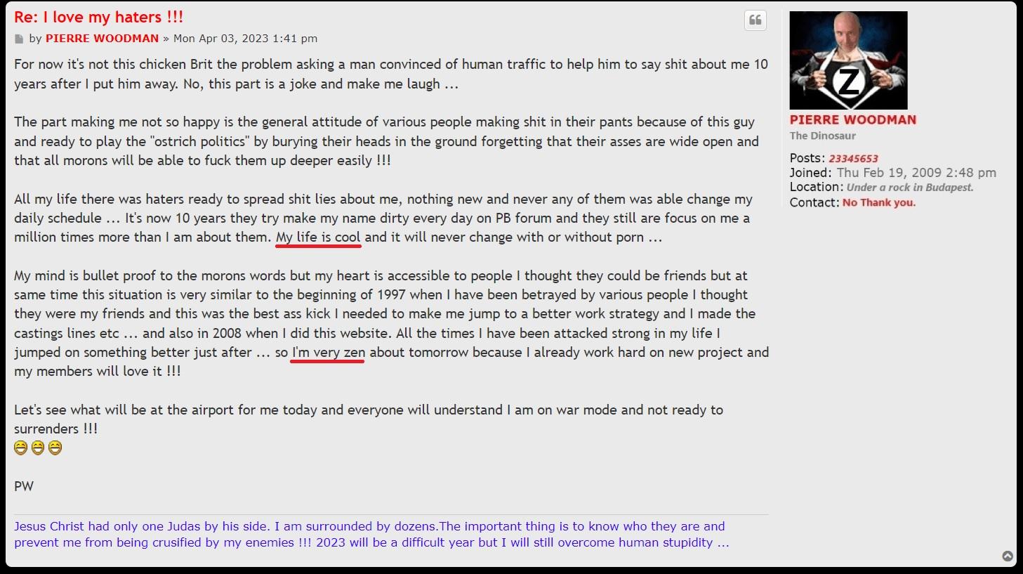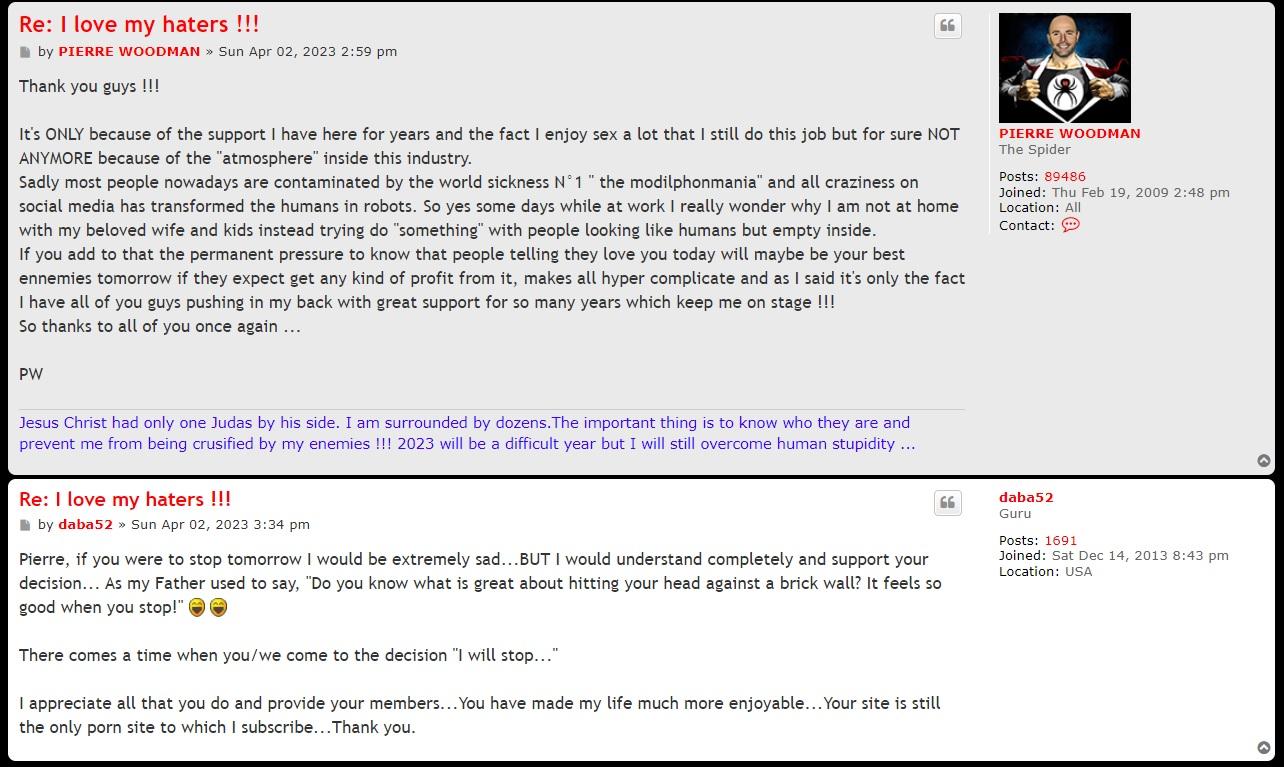 Its so funny he says he loves his haters but he cries everytime about it and the best part is he can't stand when his own members of his own forum can smell his own bullshit and when they call him out, all he can do is to fingers here. What a weak little turd who can't take responsibility for his own forum! Its what weak men do. They cam't sort their own issues so they blame others. Pornbox is to blame for all his problems. The fat ape should be a man and deal with the stupid things he says on his forum and stop blaming us if his members don't want to kiss his ass for the immoral things he does and says
