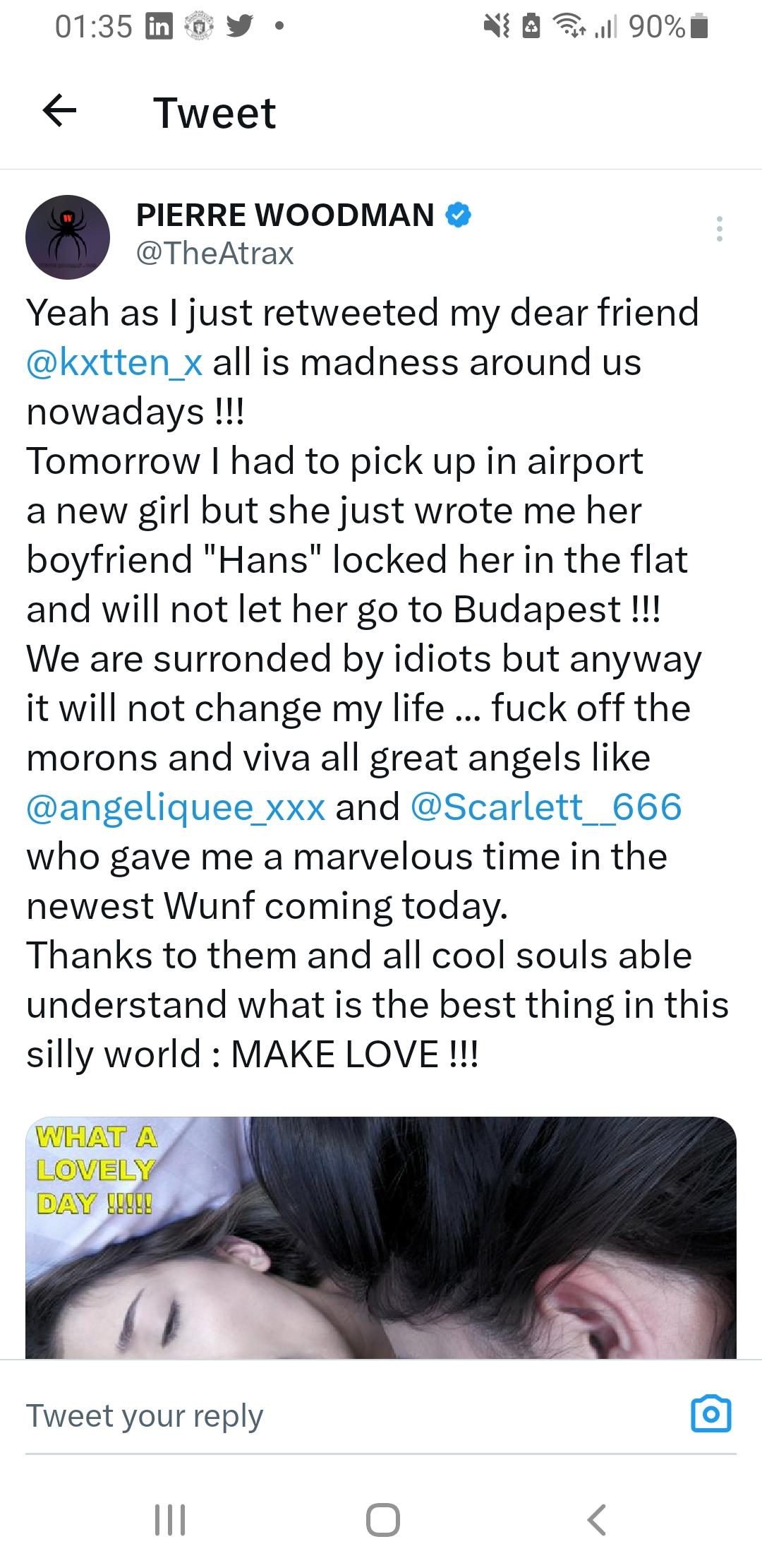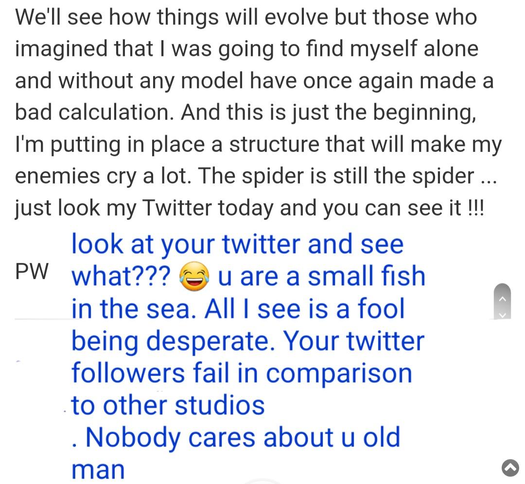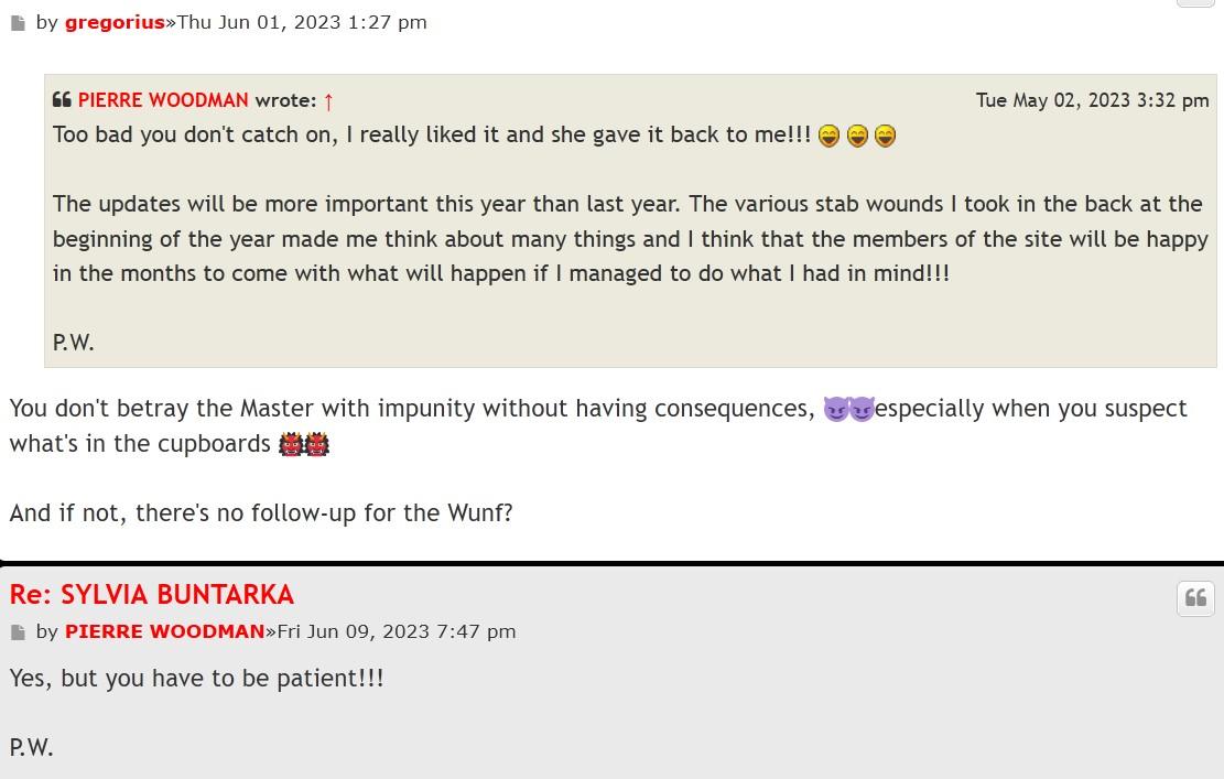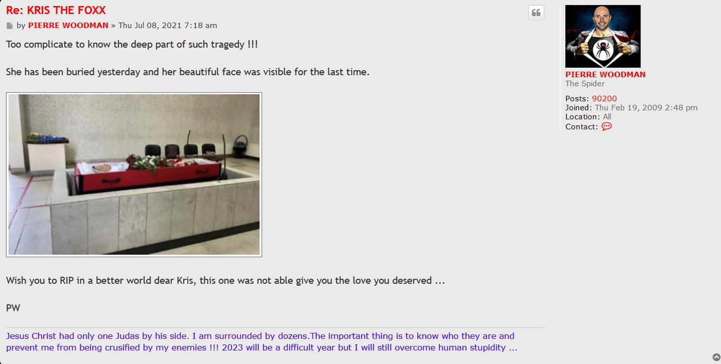 I wonder if Kriss the Foxx' depression which led to suicide, not only had to do with an allegedly badly ended love affair, but also had to do with her most likely being bullied by gerbier after she had the audacity to share social media footage where we can see the manipulation games of woodman right in front of our eyes. It shows gerbier trying to manipulate her with fake forum messages (probably posted by one of his "fake avatars" = fake troll accounts), and her not listening to him at all and only laughing at how stupid this fucking clown is.....