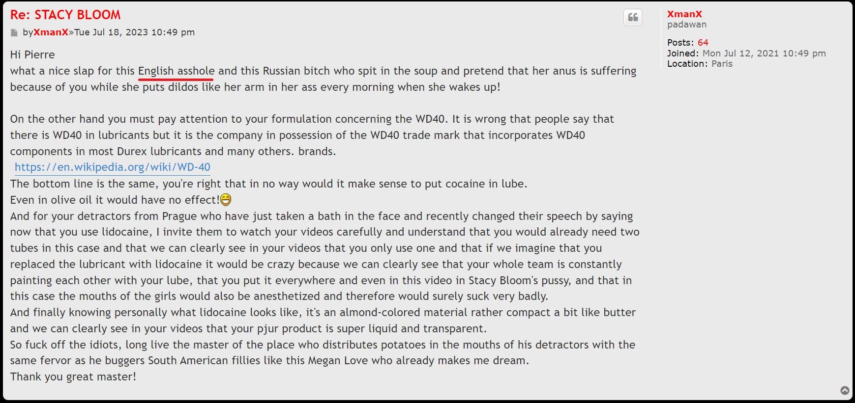 backflipman wrote:If anyone around the world heard a loud slapping sound it was me facepalming so hard after reading that PW believes there is WD-40 is in sexual lubricants. Maybe he uses WD-40 as his lubricant though which would explain why Serenity Haze said it burns and also how other models felt strange after the shooting, because something like WD-40 resorbed by the intestinal mucosa would certainly fuck up your system.