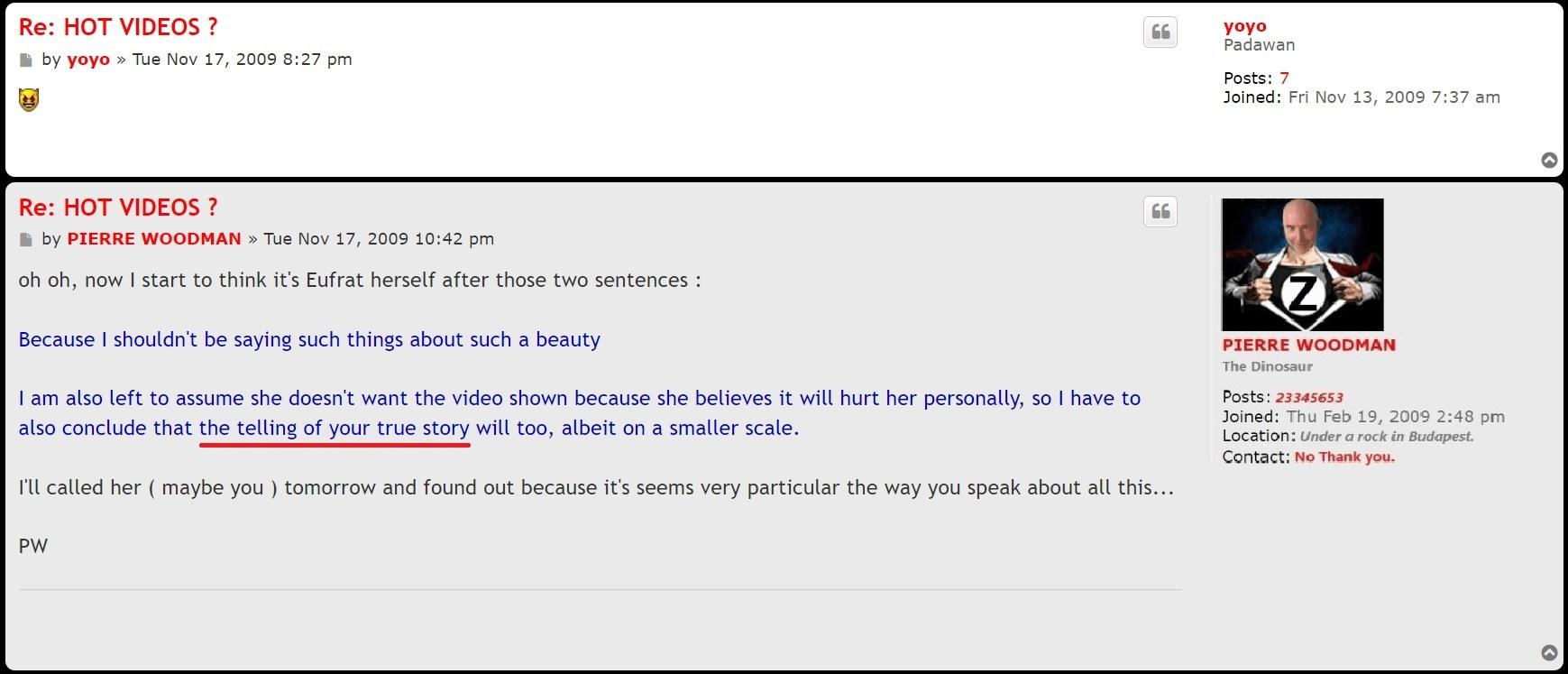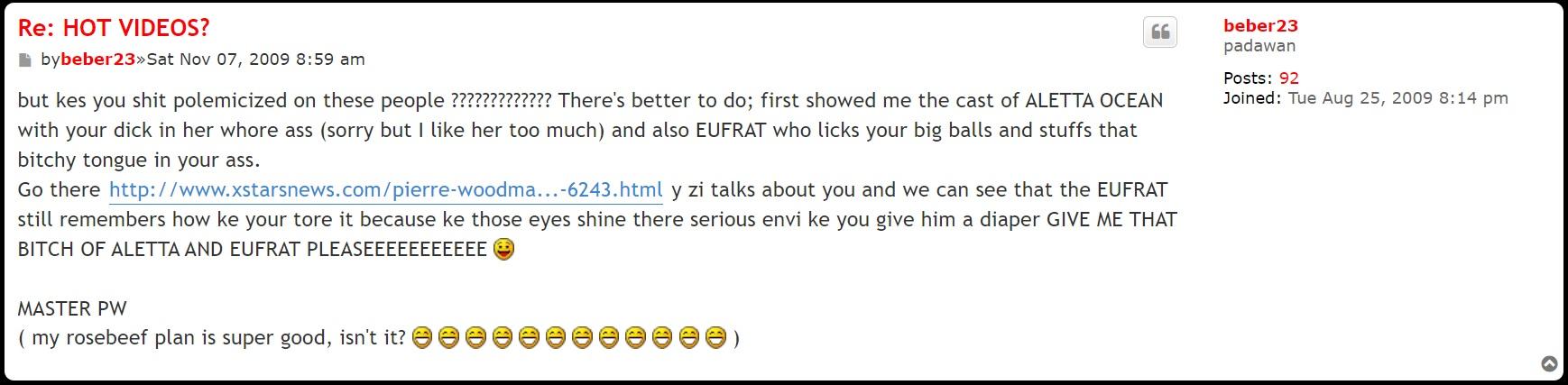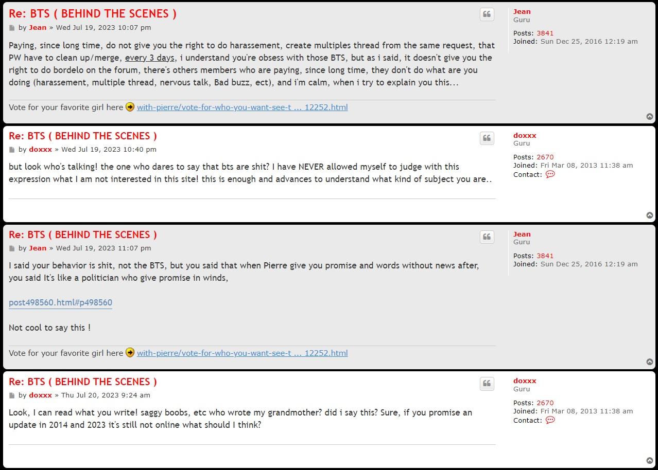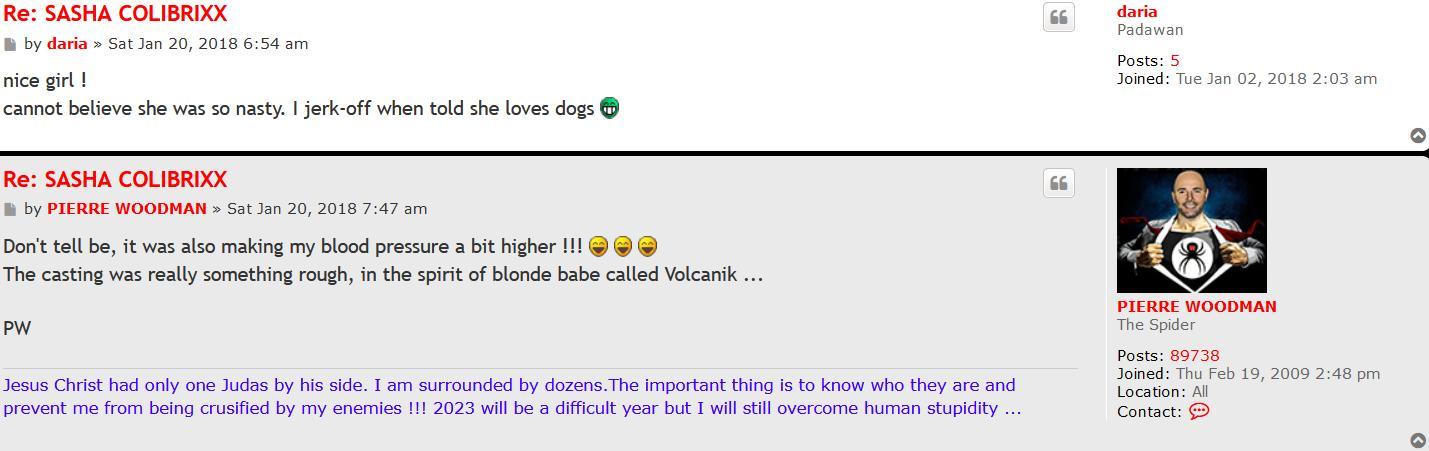 (but who cares?) for as long as possible. He will insist that you write nicely about him on your social media. He may even want to take over those accounts for self-promotion. If you have in fact worked for others before, he badgers you to say that only now have you found a good serious director. He will publish 'your' comments on his forum, where his dupes will come online with "Did you destroy her, master, did you fill her with your piss?", because he's promised them that there are more and dirtier scenes of you in the box. If you object, he will bash and trash you, call you a 'snake', shout that you are a cold stupid difficult girl who is only interested in money.