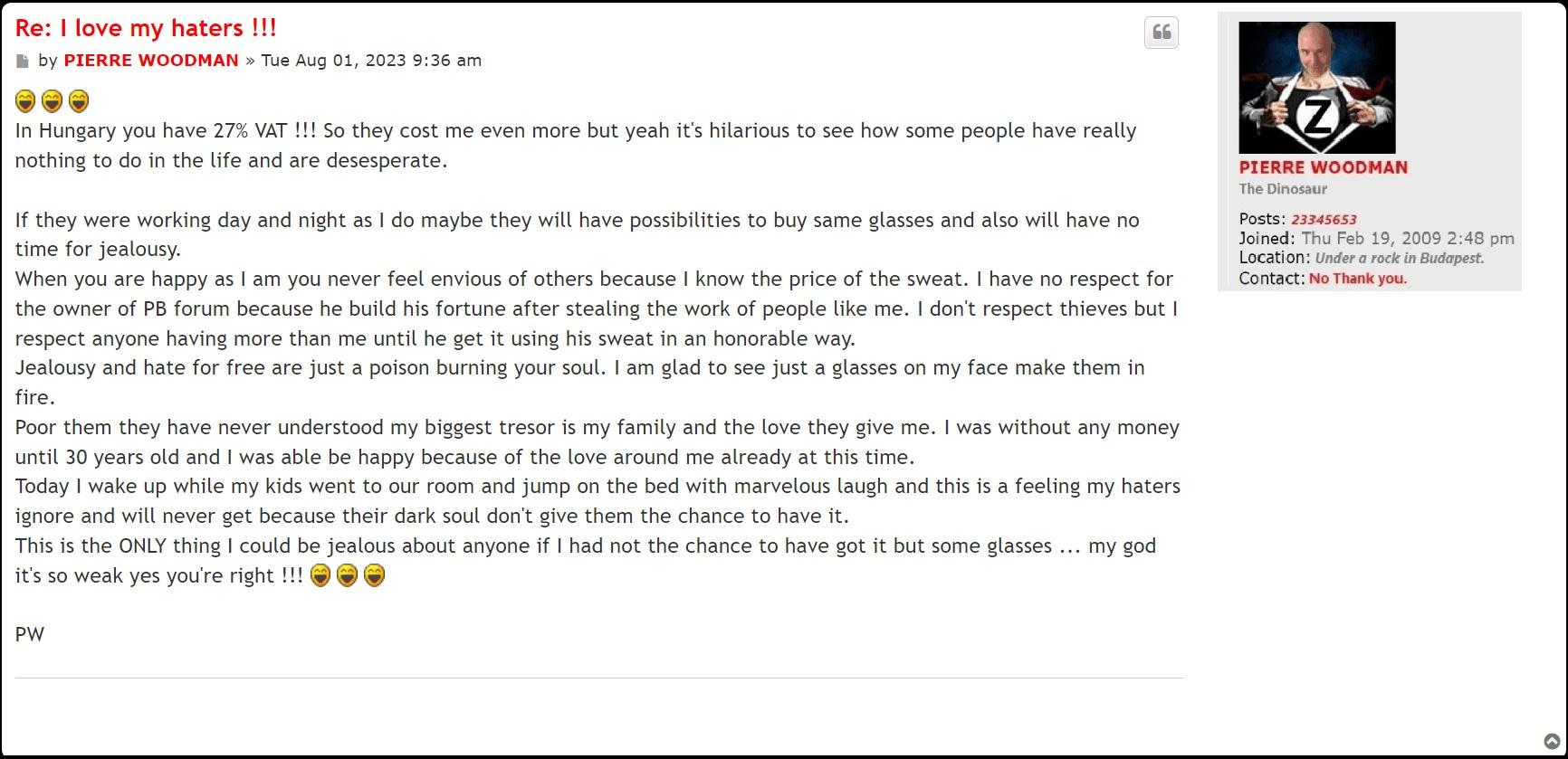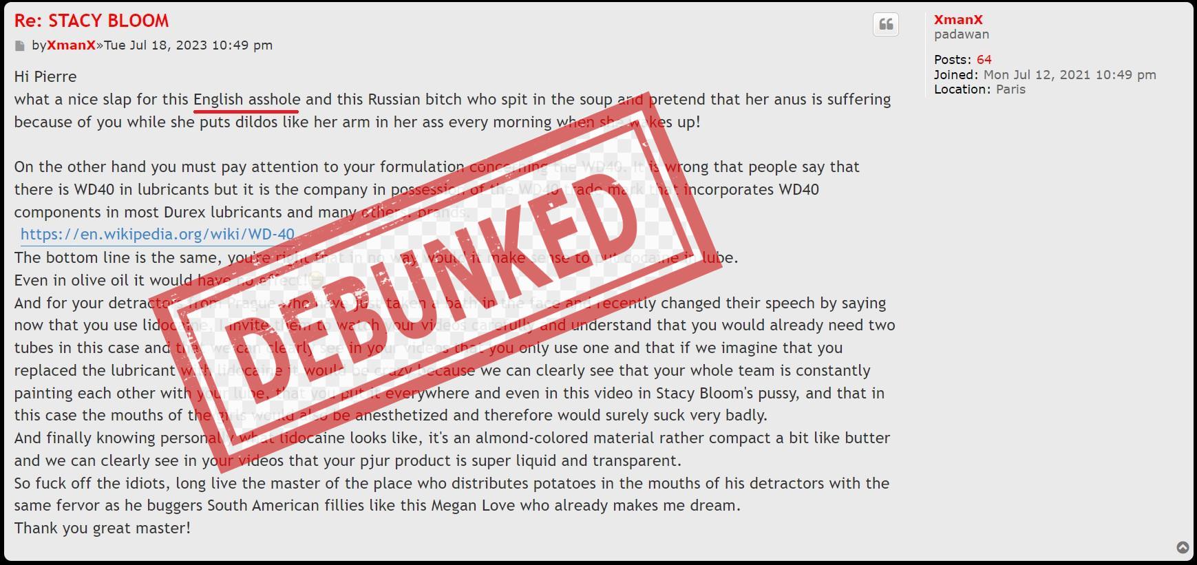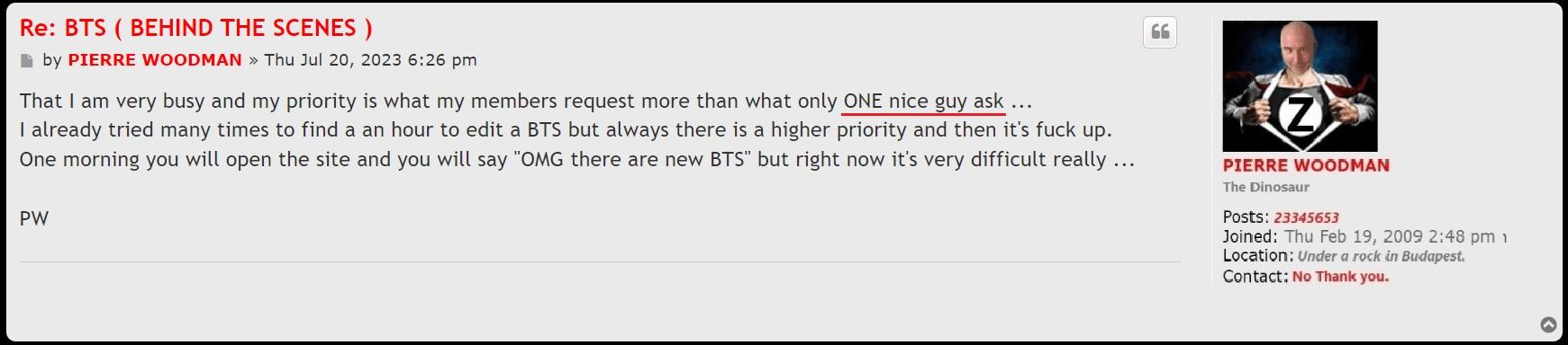 (but who cares?) for as long as possible. He will insist that you write nicely about him on your social media. He may even want to take over those accounts for self-promotion. If you have in fact worked for others before, he badgers you to say that only now have you found a good serious director. He will publish 'your' comments on his forum, where his dupes will come online with "Did you destroy her, master, did you fill her with your piss?", because he's promised them that there are more and dirtier scenes of you in the box. If you object, he will bash and trash you, call you a 'snake', shout that you are a cold stupid difficult girl who is only interested in money.