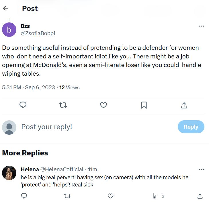 Sorry to write this to you but I searched the history of your posts, and I wonder how you can be a veteran of this forum with so few comments on models and porn scenes, you are absolutely not a fan of porn and you are not here to have fun or to discuss porn or the scenes sold here or on sites affiliated with the company, no your only pleasure is to insult and pour out your hatred on a producer that you don't even know and that you should ignore since you don't appreciate his work, it's not what any normal human being does to select what he likes to see and boycott what he doesn't like to see, imagine a bit of a mess it would be if everyone started insulting Spielberg, calling him a Mongolian, a liar, fake guys and others when you just have to not go see his films instead of wasting your time insulting pour out his hatred, I don't know what this man did to you but we feel great frustration in you!