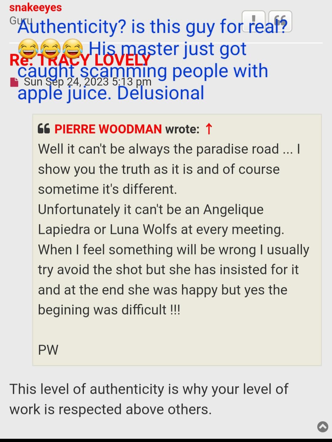Not only did he reveal himself once again to be a liar and manipulator, but now he also revealed himself to be a scam artist. Woodman must have made millions through all his lies. How many members have been following him on the basis of what he does is "real"