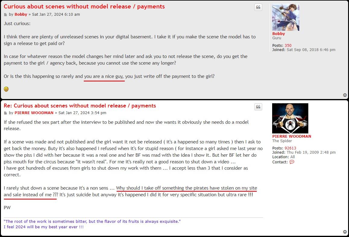 The problem is that PW himself has been using apple juice (so faking things) but he goes around saying that with him it's all 100% real, and that's what he tells to members... so yeah, it's deceving and that's it. And to make matters worse he accuses other productions of faking golden shower.![]()
