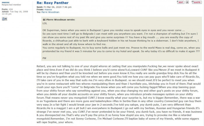 WoodyTheSmallPecker is a notorious liar.That CUNT is lying 24/7, so nobody gives a fuck what he says-writes.That pussy never had balls to meet me 1 on 1 in Budapest or any other city.Maybe you can join him, maybe you two CUNTS will grow some balls, face me and end up with broken jaws?Do you have balls to meet me, you fucking pussy?