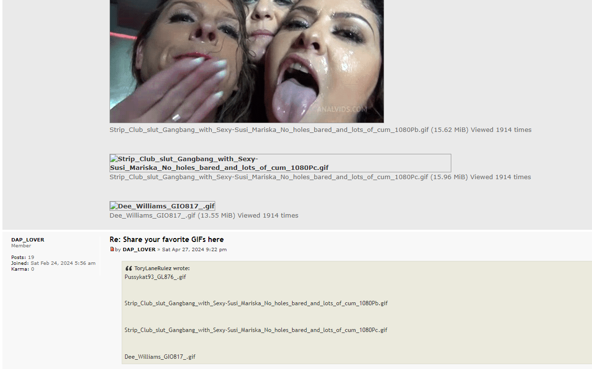 misangrenegra2 wrote:I "have the suspicious" that if you navigate in some specific threads with a lot of bugged images like the asshole appreciator or girls faces surrounded by cocks, overloaded the forum or something like that because the pics are just bugged and it seems that you provoke to the site a lot of request and you are "rejected" (IP for a while), then you have to wait. Even if you try to post some pics happens this.