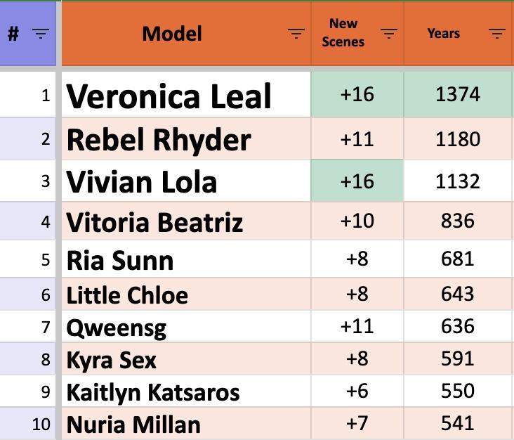 Anna with only 5 scenes is outside top-10 for now, Claudia Mac and Mina are outside top-20 (both did less than 5 scenes in 2024).