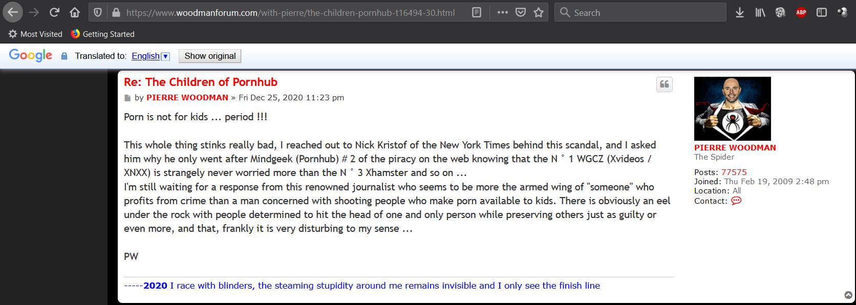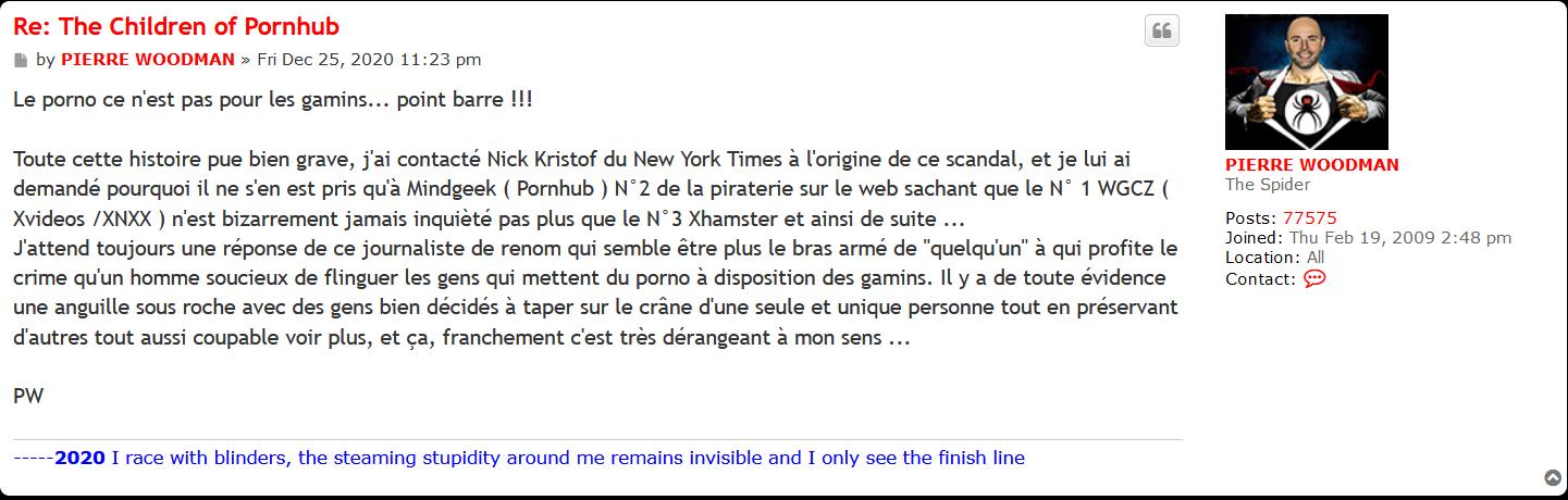 Caveman39 wrote:So, I was searching Google for the latest developments on this and came across a schizophrenic forum where the protagonist is talking to himself with multiple troll accounts. In stead of spending time with his family, it looks like this part-time father rather spends Christmas days writing e-mails to the journalist of the New York Times (who did the story on PH) asking/demanding an explanation as to why he didn't/doesn't go after WGCZ/xxx/Xvideos/XNXX. What a pathetic hyper idiot. Acting as if it's all about the children's eyes he want to save from porn LOL, but it's all about a failed David dreaming to take down Goliath.