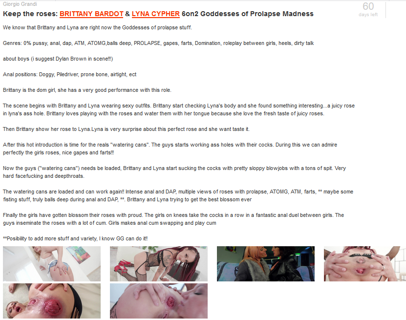 I absolutely second your request for a prolapse madness fest with Lyna Cypher and Brittany Bardot who is my favourite Legalporno model with the juiciest rose ever. It has been way too long since her last scene, so please Giorgio let us know when it's planned that you will shoot her again.