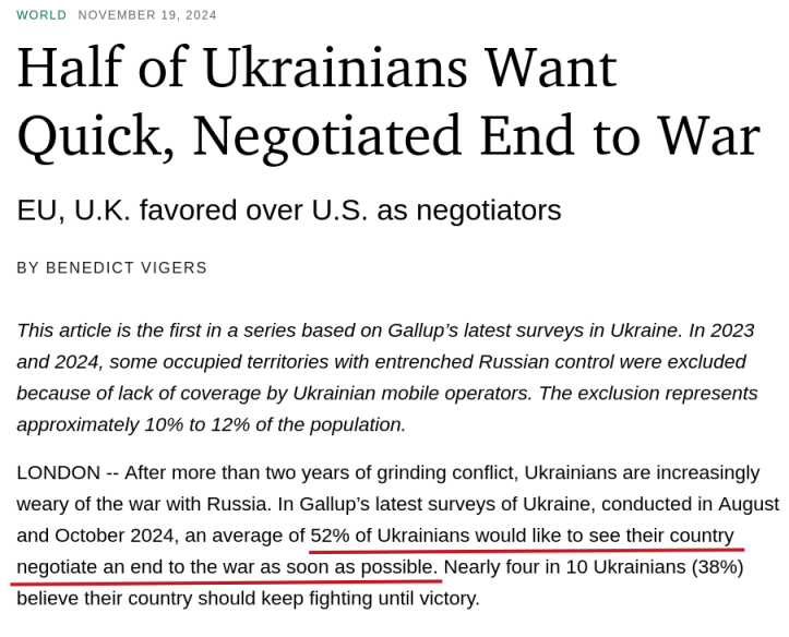 that opinion being that a majority ukrainians want Zelensky out of office asap (60% don't want him to run in any future elections) and for the war to end with a peace agreement asap (52% in latest Gallup poll, november 2024)