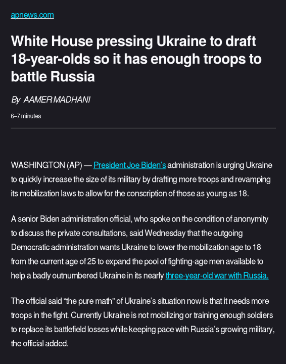 washington is demanding ukraine lower conscription age to 18, and NATO is saying it won't allow ukraine to negotiate a peace until it's in 'a position of strength' (as if that is or was EVER going to happen)