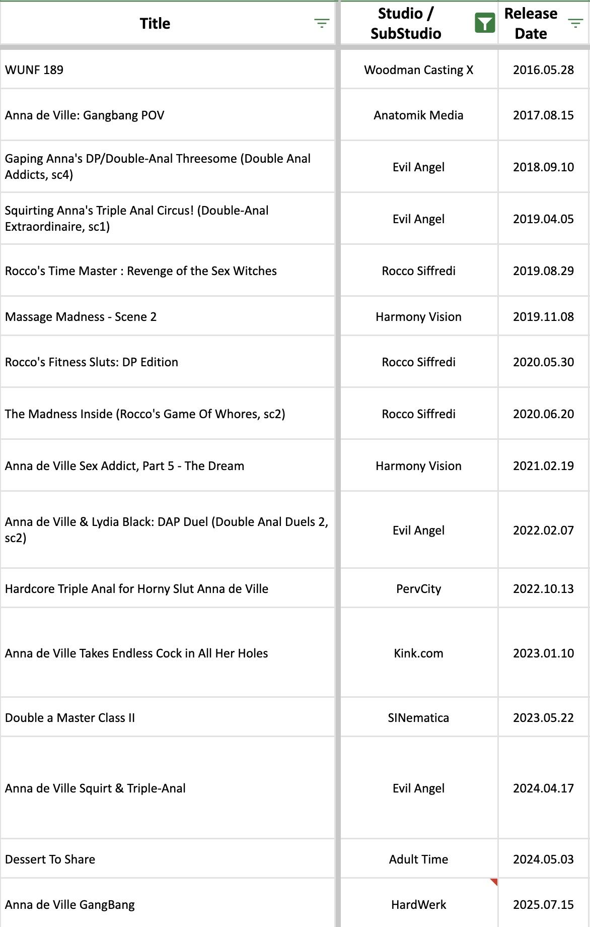 I'm pretty sure it's because in this table I counted only main LPAV studios, not all PornBox or outside. But you are right, there were some mistakes because I checked this table now and here is 113 DAP for Brittany despite she was not active since this picture was published. I recall I fixed some mistakes for Adeline, probably for Brittany too. Anyway, as I said above, I'll extend the counting, f.e. now I'm finishing with Rebel.